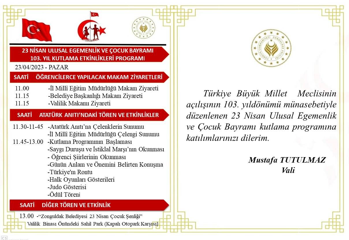 Kutlama programı tören alanında çelenk sunumu ile devam edecek. Program öğrenci şiirlerinin okunması, günün anlam ve önemini belirten konuşmalarının ardından halk oyunu ve judo gösterileri sergilenecek. Ödül töreninin ardından kutlama programı sona erecek.