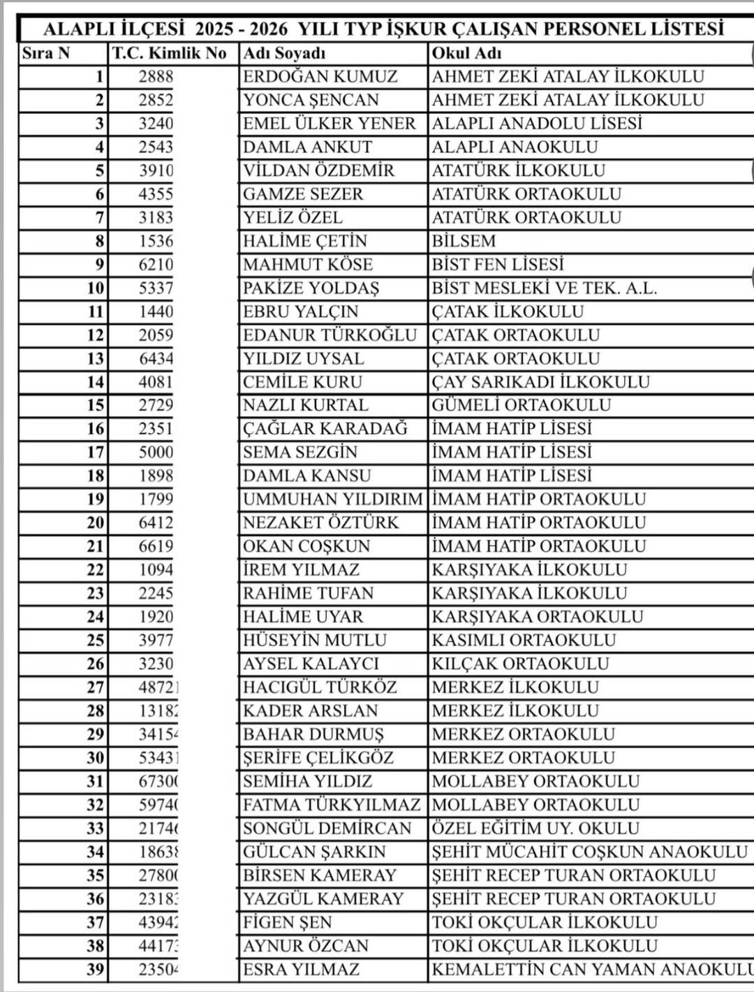 Alaplı İlçe Milli Eğitim Müdürlüğü bünyesine Toplum Yararına Program (TYP) kapsamında alınacak 39 kişi belli oldu.