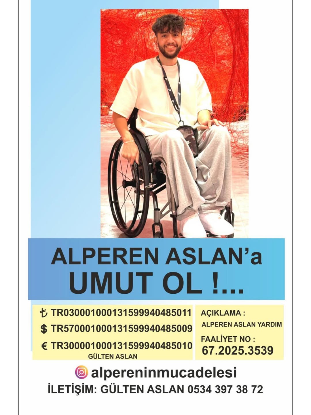 Zonguldak’ta 2001 doğumlu doğuştan işitme engelli Alperen Aslan, 2021 yılında evinin balkonunda dengesini kaybederek beton zemine düştü. Alperen Aslan, geçirdiği kazada omuriliğinin zarar görmesi nedeniyle felç geçirdi. Aslan’ın tekrar ayağa kalkarak yürüyebilmesi için epidural stimülasyon ameliyatı olması gerekiyor. Ancak 65 bin dolar olan tedavi masrafları için maddi desteğe ihtiyacı var.