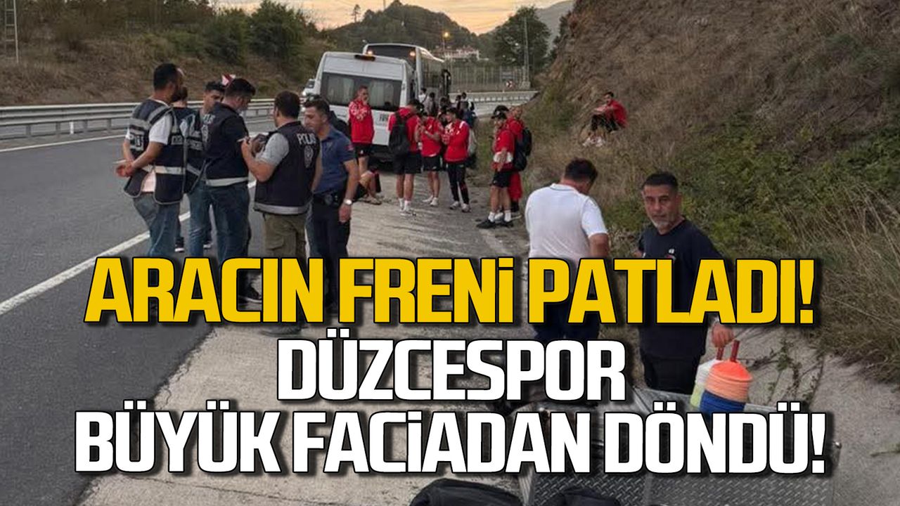 Düzcespor'u taşıyan Takım Otobüsünün freni patladı.Takım Otobüsün freni patlaması sonrasında futbolcular ve teknik heyet büyük panik yaşadı.Ancak takım otobüsü şöförü zorda olsa aracı durdurmayı başardı.