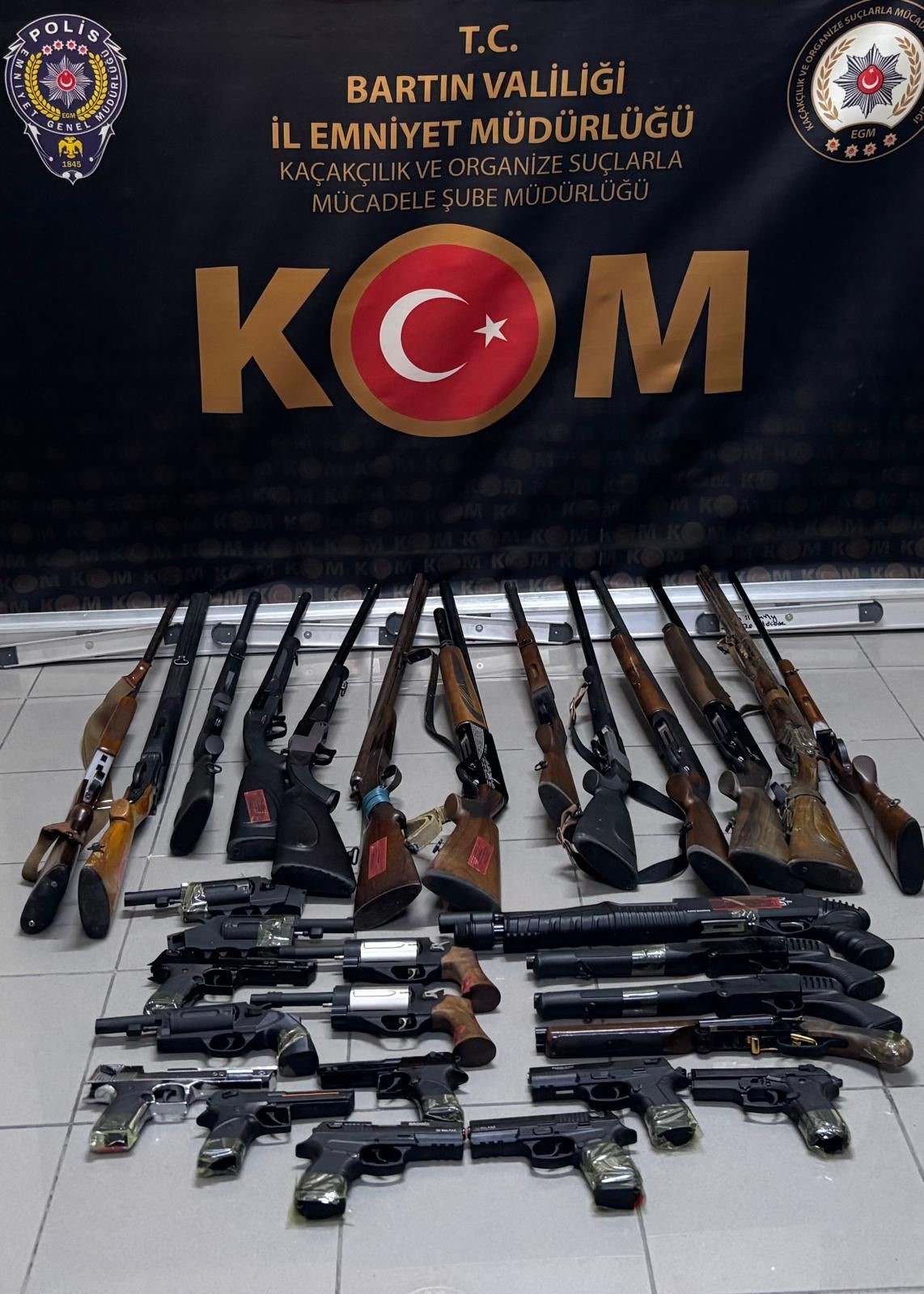 Bartın Cumhuriyet Başsavcılığınca yürütülmekte olan bir soruşturma kapsamında Bartın Emniyet Müdürlüğü Kaçakçılık ve Organize Suçlarla Mücadele Şubesi ekipleri, 6136 sayılı Ateşli Silahlar ve Bıçaklar ile Diğer Aletler Hakkındaki Kanun'un 13'üncü maddesine muhalefet nedeniyle bir iş yerine baskın düzenledi. Operasyonda, 17 Adet ruhsatsız av tüfeği, 8 Adet kurusıkı tabanca, 5 adet ruhsatsız tabanca ele geçirildi.