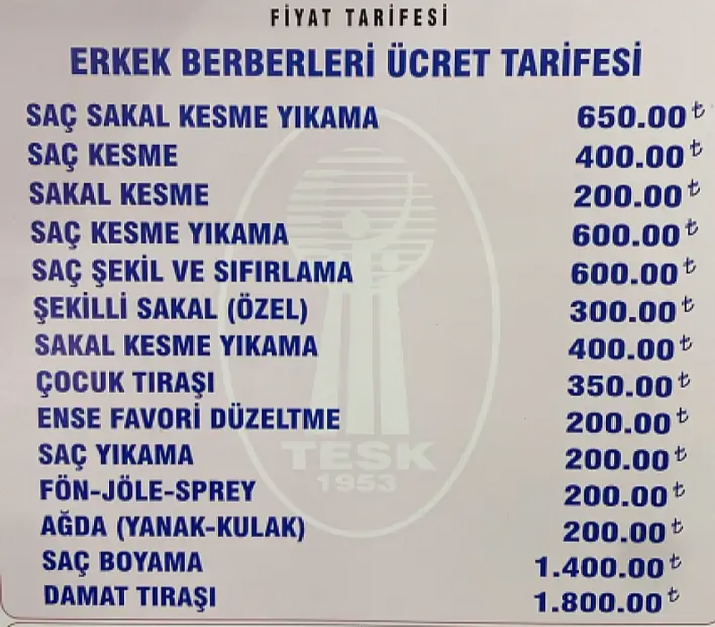 Şekilli sakal kesimi 300 TL, sakal kesimi ve yıkama 400 TL, çocuk tıraşı 350 TL olarak belirlendi. Ense ve favori düzeltme, saç yıkama ile fön–jöle–sprey uygulamaları 200 TL olarak tarifeye girdi.