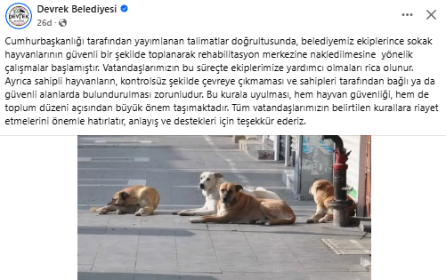 Devrek Belediyesi, Cumhurbaşkanlığı tarafından yayımlanan talimatlar kapsamında sokak hayvanlarının güvenli bir şekilde toplanarak rehabilitasyon merkezine nakledilmesine yönelik çalışmalara başladığını duyurdu. Belediyeden yapılan açıklamada, sürecin tamamen kontrol altında ve hayvanların sağlığı gözetilerek yürütüleceği belirtildi.