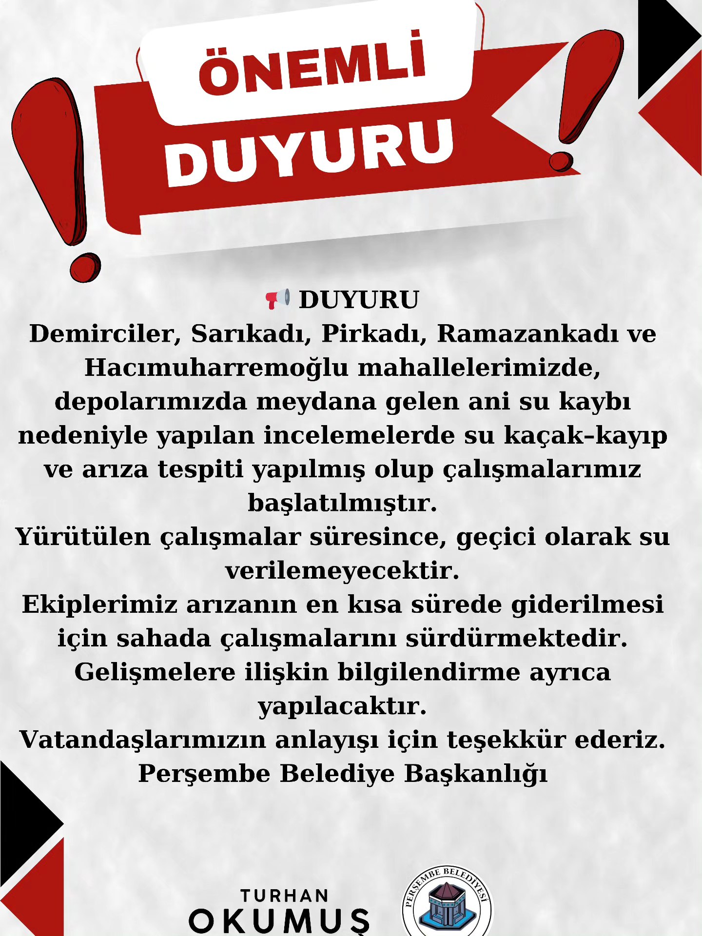 Belediyeden yapılan duyuruya göre; Demirciler, Sarıkadı, Pirkadı, Ramazankadı ve Hacımuharremoğlu mahallelerini kapsayan bölgelerde başlatılan çalışmalar nedeniyle geçici süreyle su verilemeyecek. Ekiplerin sahada arızayı gidermek için yoğun şekilde çalıştığı belirtilirken, sorunun en kısa sürede çözülmesinin hedeflendiği ifade edildi.