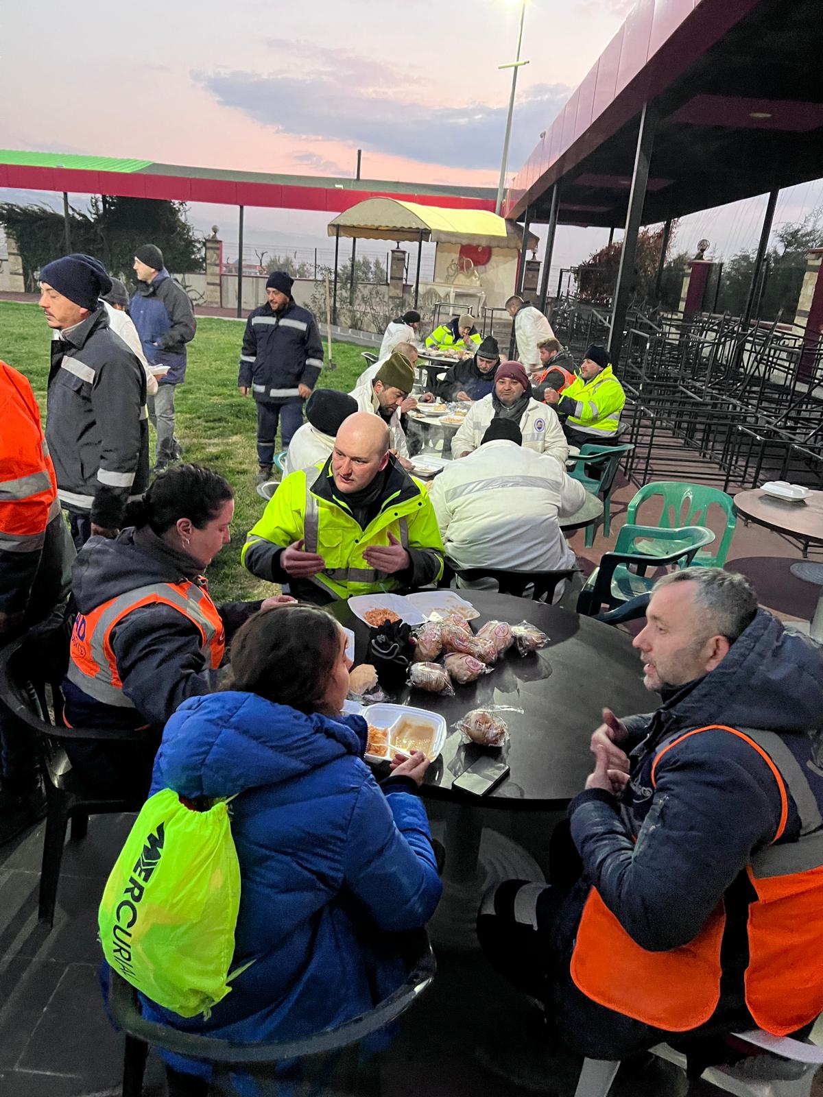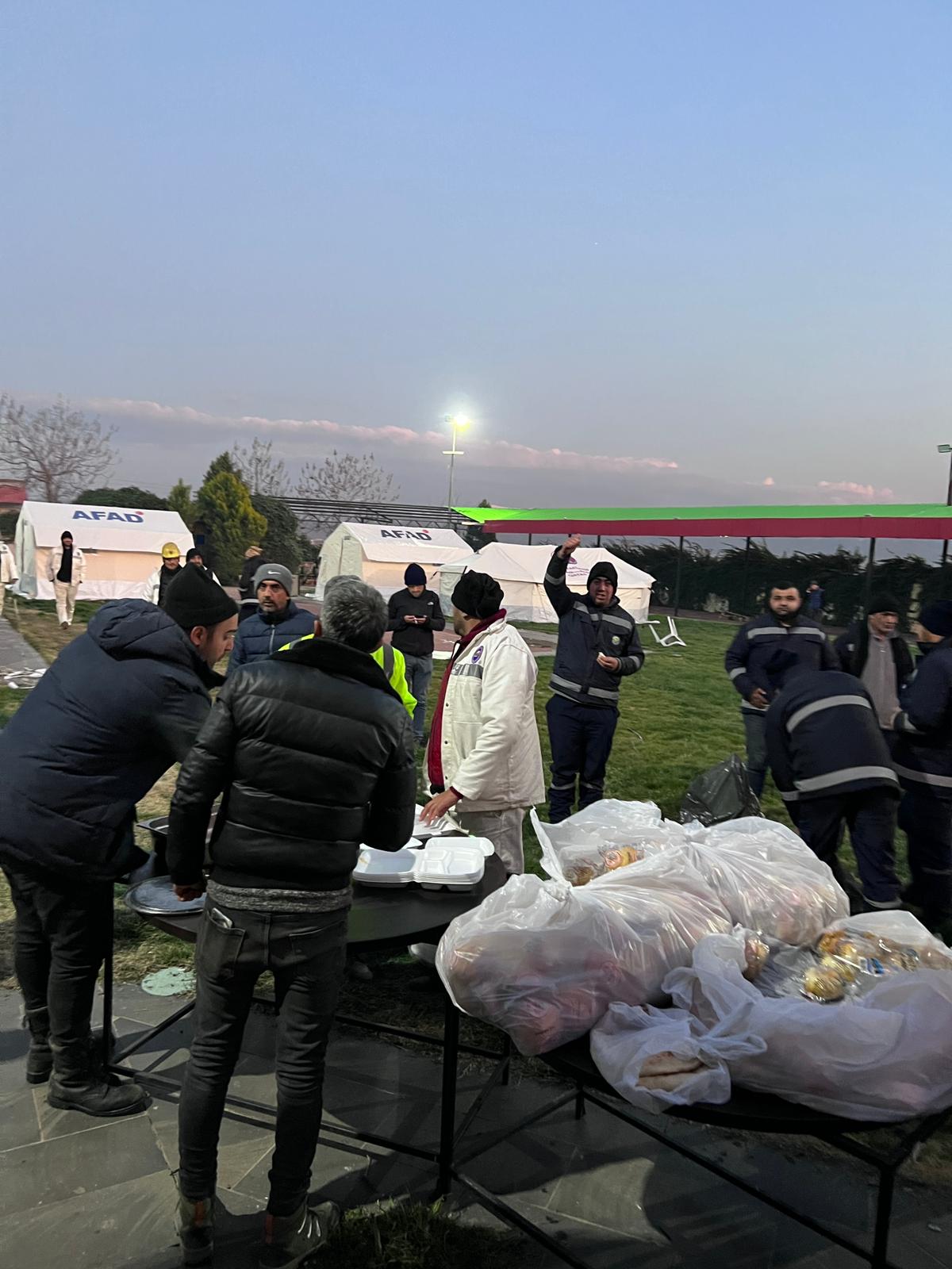 Arama kurtarma çalışmasına katılan ekiplerin yemek yediği açık hava mutfağında depremzedeler de yararlanabiliyor.