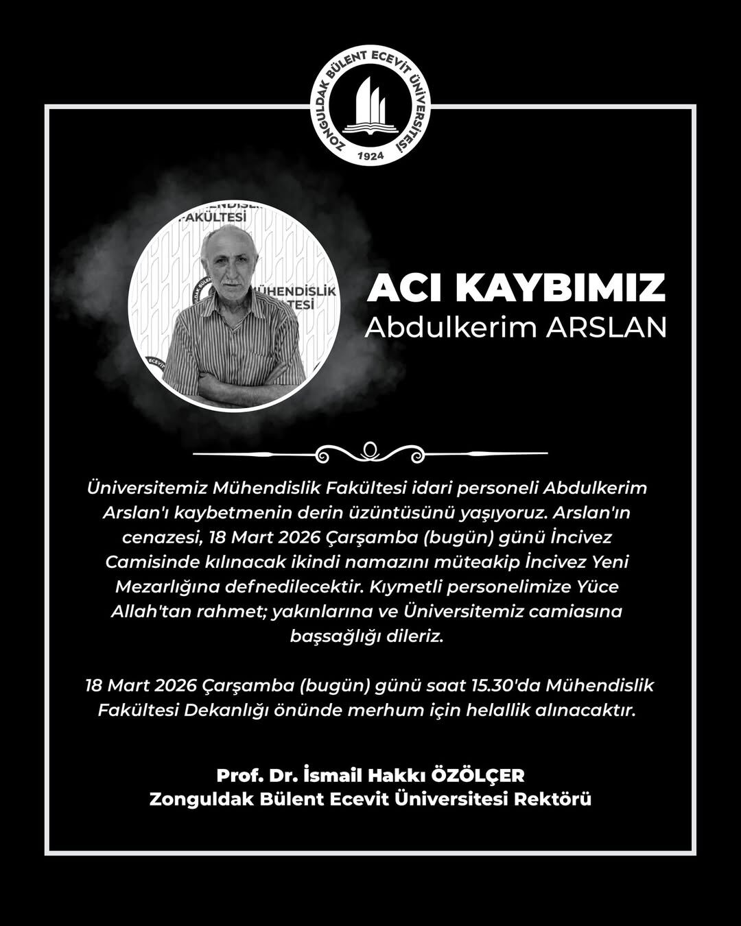 Zonguldak Bülent Ecevit Üniversitesi Mühendislik Fakültesi idari personeli Abdulkerim Arslan hayatını kaybetti.