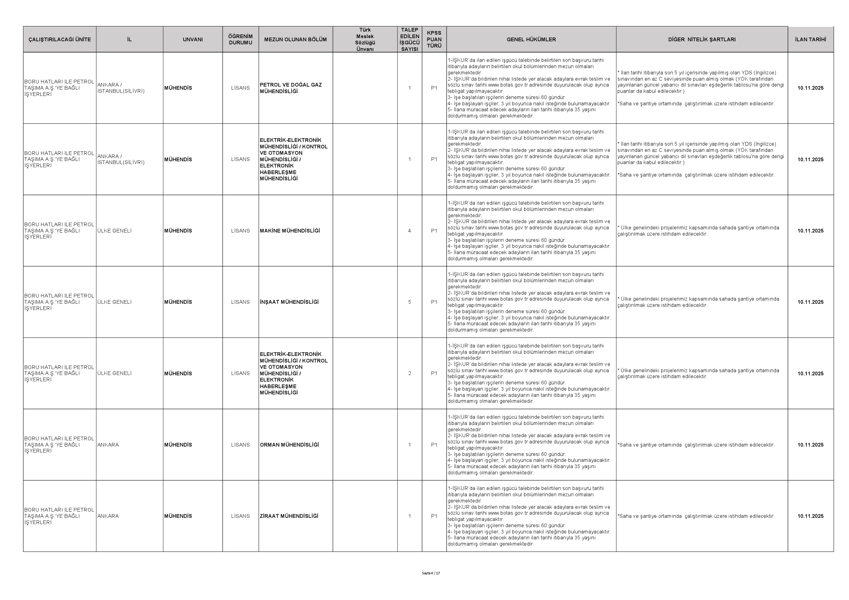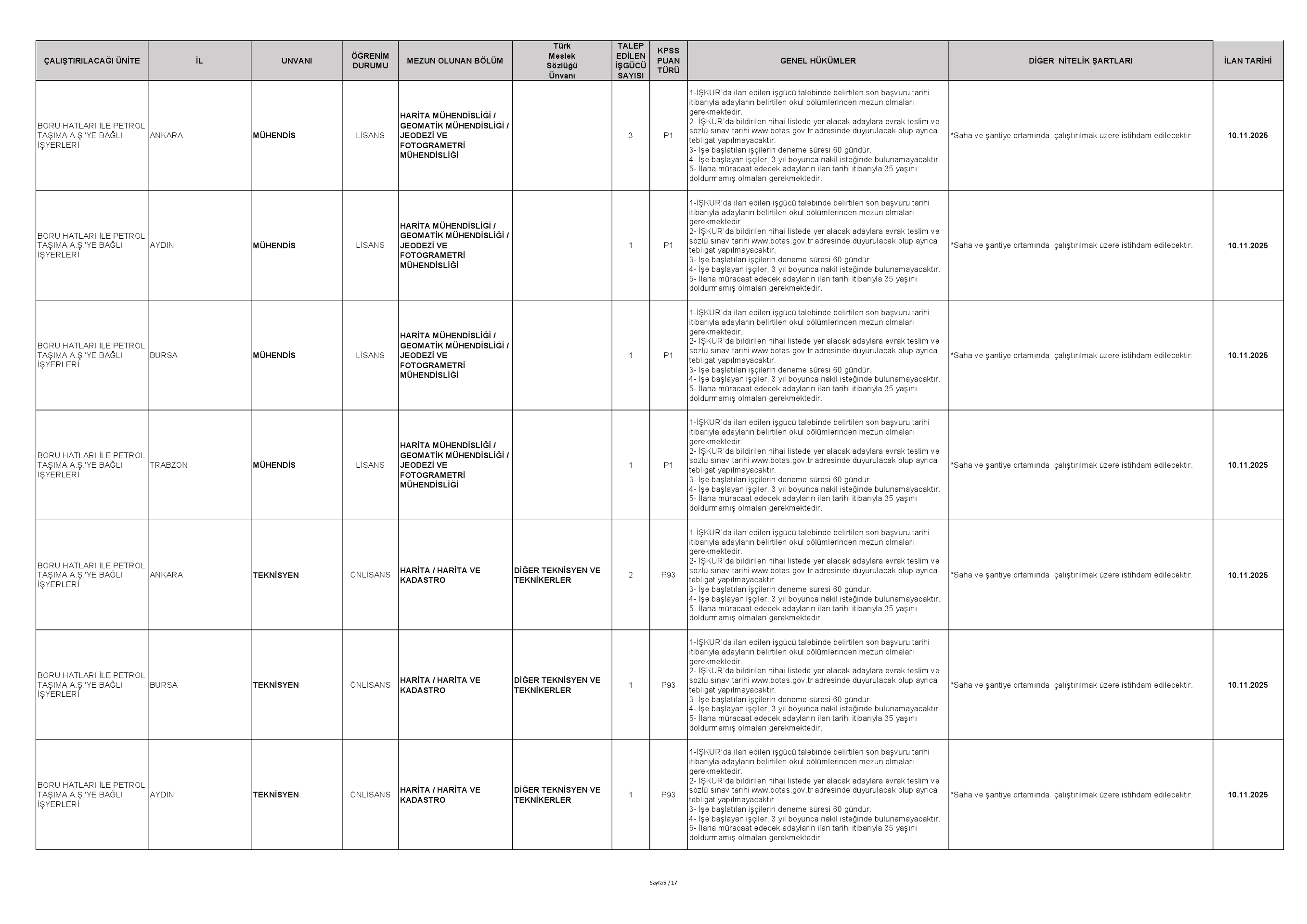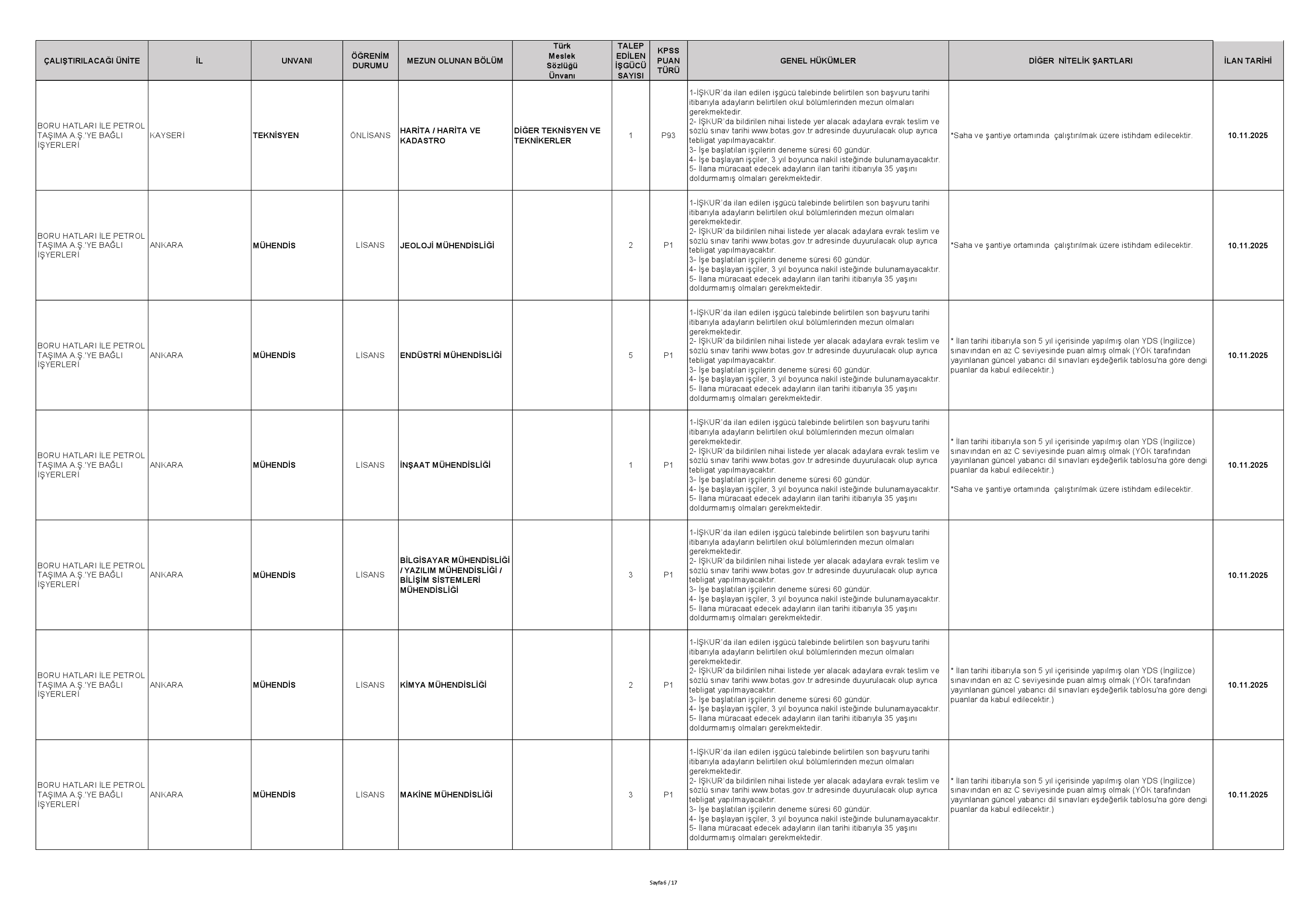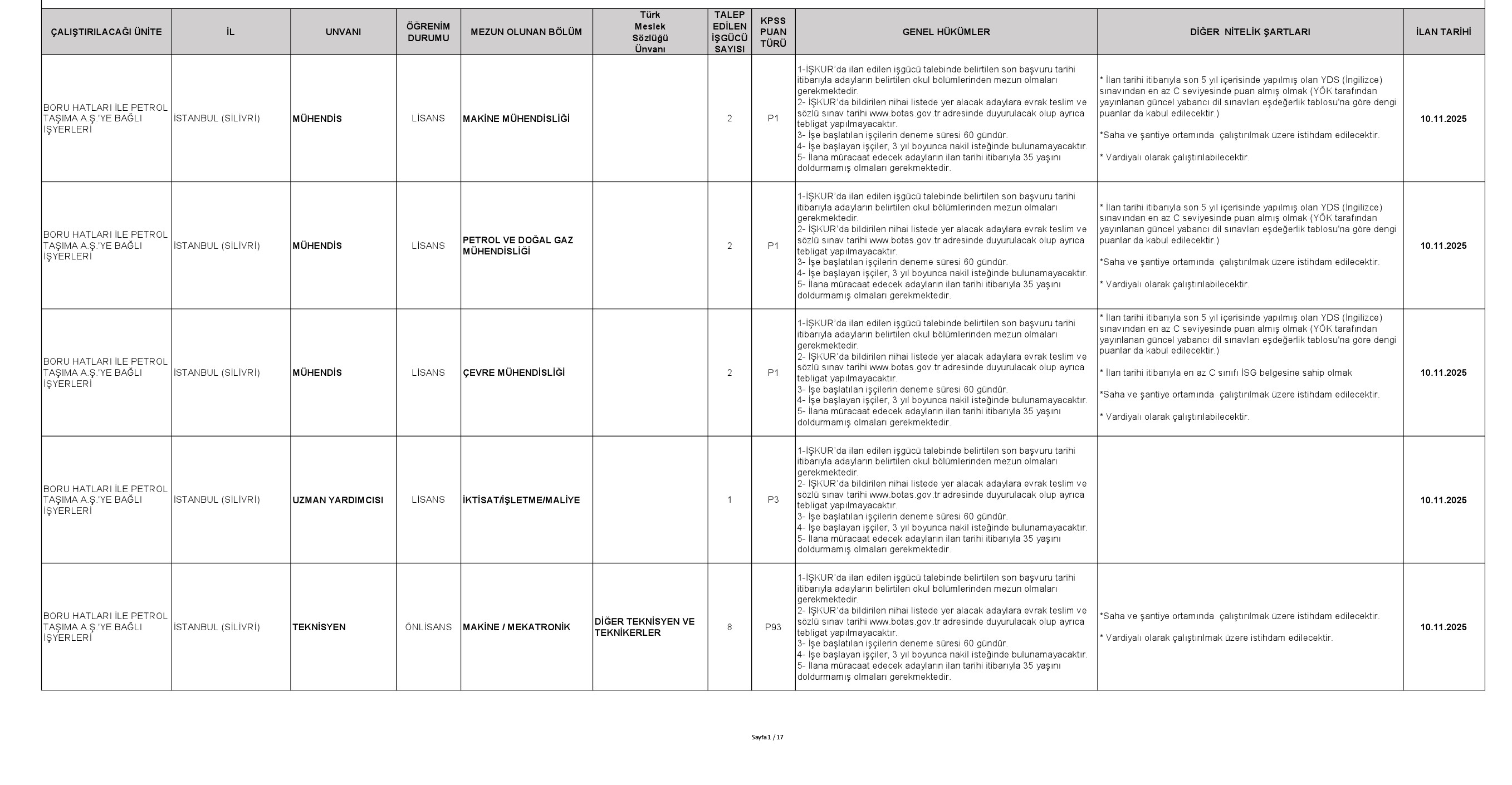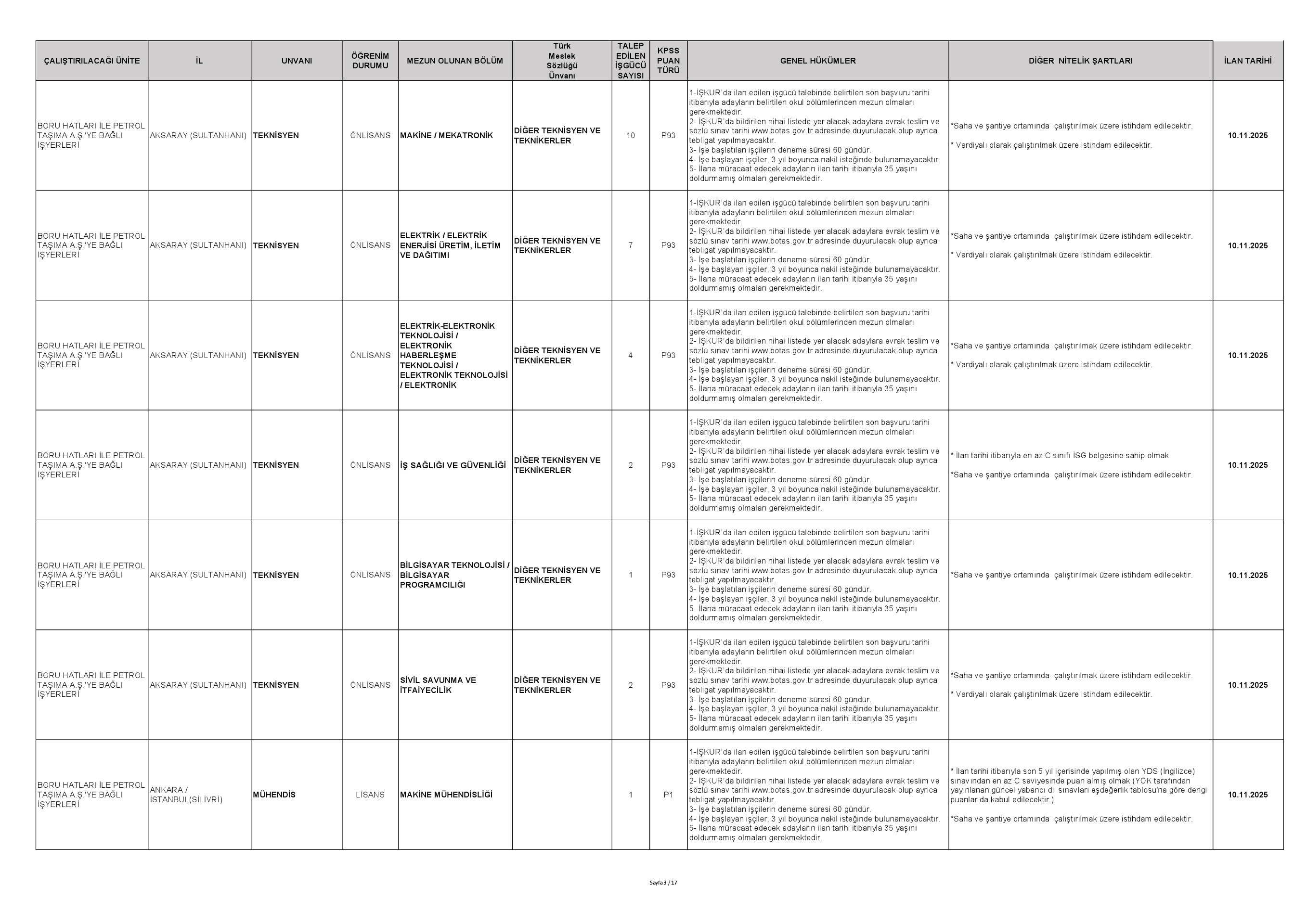 Boru Hatları İle Petrol Taşıma A.Ş. Genel Müdürlüğü BOTAŞ, "uzman yardımcısı, teknisyen, mühendis, büro görevlisi" kadrolarında istihdam edilmek üzere 223 işçi alacak. İŞKUR tarafından oluşturulacak nihai listede yer alacak adaylar, kurum bünyesinde yapılacak mülakata davet edilecek. Son başvuru tarihinin 14 Kasım olduğu belirtildi.