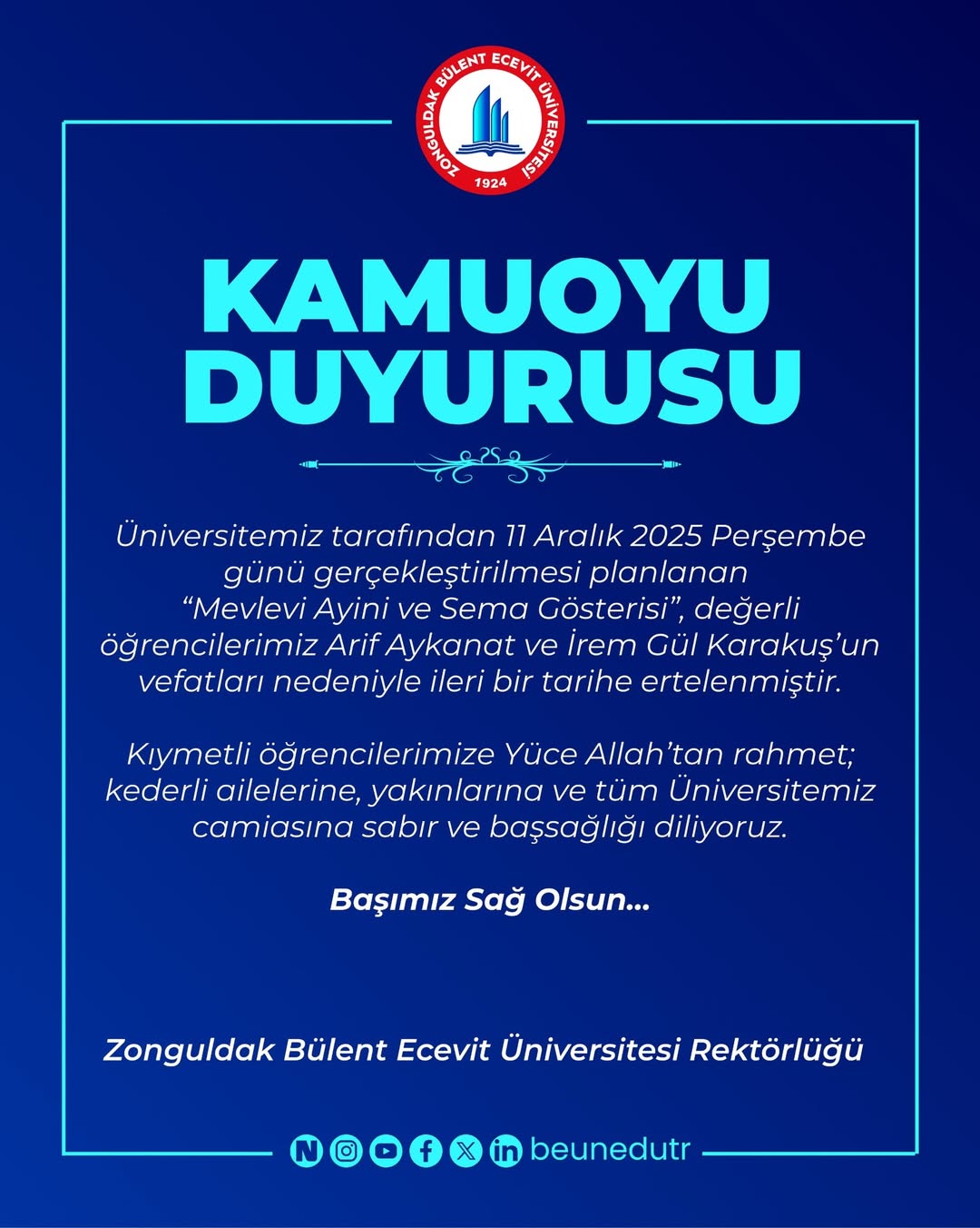 “Üniversitemiz tarafından 11 Aralık 2025 Perşembe günü gerçekleştirilmesi planlanan “Mevlevi Ayini ve Sema Gösterisi”, değerli öğrencilerimiz Arif Aykanat ve İrem Gül Karakuş’un vefatları nedeniyle ileri bir tarihe ertelenmiştir. Kıymetli öğrencilerimize Yüce Allah’tan rahmet; kederli ailelerine, yakınlarına ve tüm Üniversitemiz camiasına sabır ve başsağlığı diliyoruz. Başımız sağ olsun…”