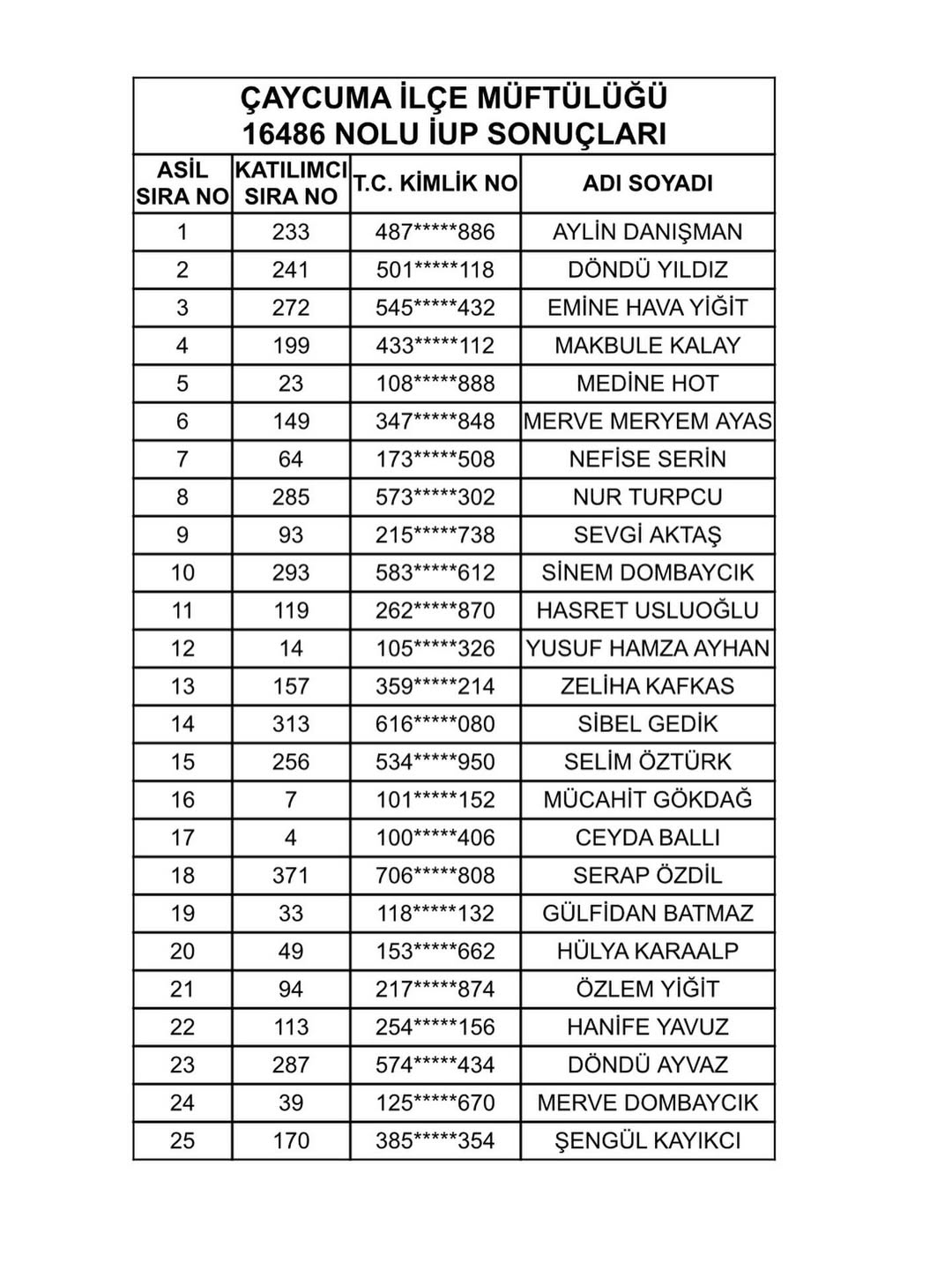 Çaycuma İlçe Müftülüğü’ne İşgücü Uyum Programı kapsamında alınacak 25 kişi belli oldu.