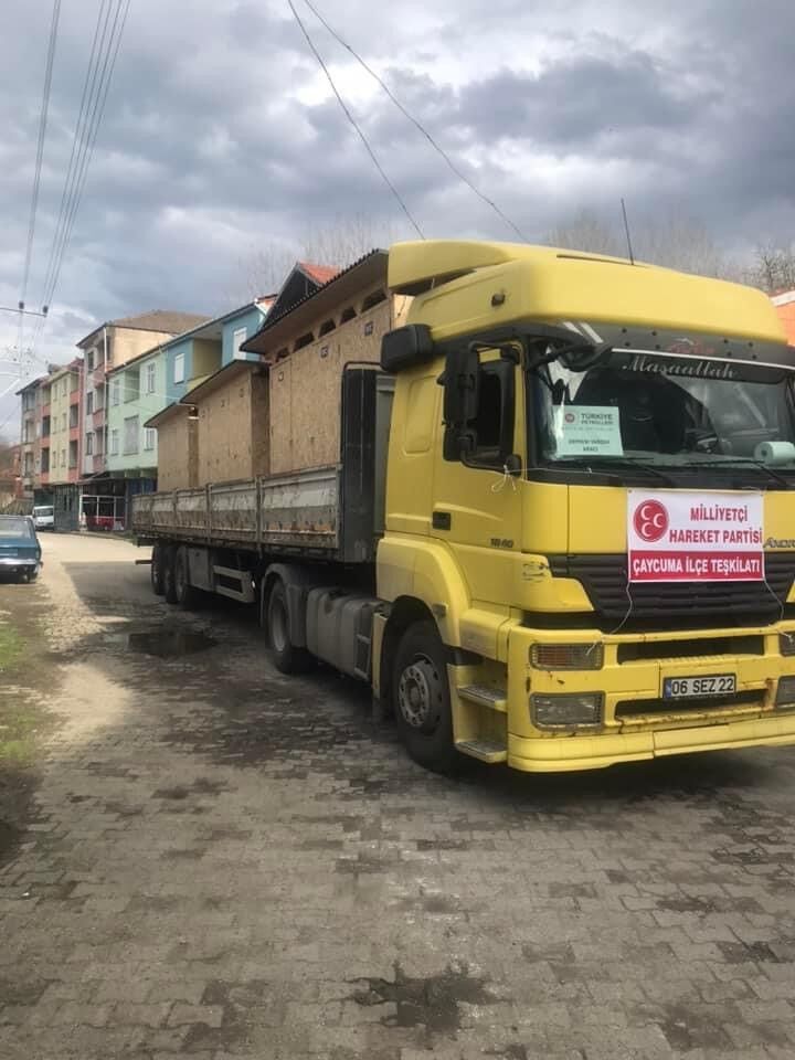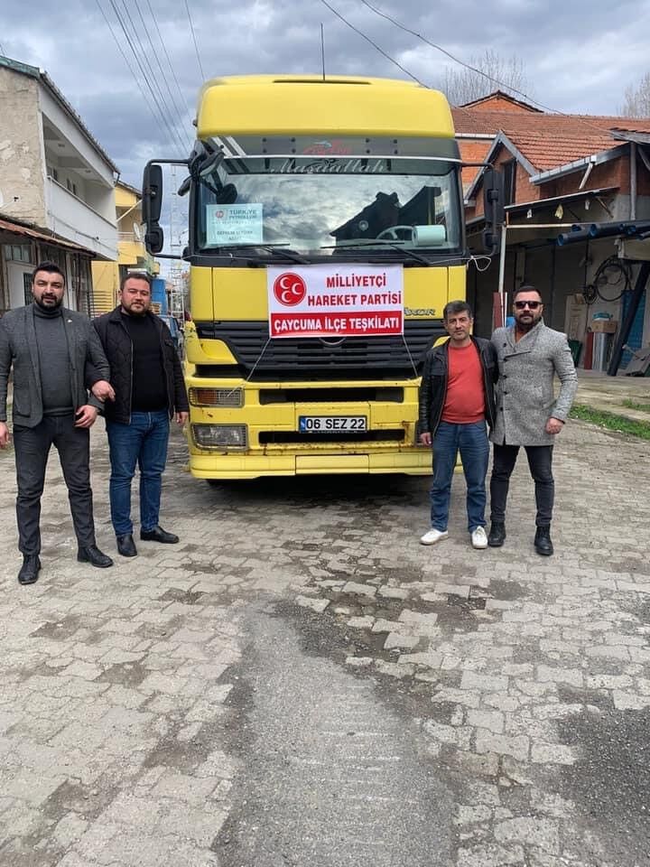 Milliyetçi Hareket Partisi (MHP) Çaycuma İlçe Teşkilatı tarafından deprem bölgesine yardımlar devam ediyor. İlçe Başkanlığı acil ihtiyacı bulunan mobil tuvaletlerin yapımını tamamlayarak deprem bölgesine sevki gerçekleştirildi. Konuyla ilgili olarak MHP İlçe Başkanlığı sosyal medya hesabından yapılan açıklamada; “ Afet Bölgesi için ihtiyaç duyulan ‘Mobil Tuvaletlerimiz’ tırımıza yüklenerek afet bölgesine doğru yola çıkmıştır. MHP Çaycuma İlçe Başkanlığı olarak bölgede yaşam normale dönene kadar vatandaşlarımızın yanında olmaya devam edeceğiz. Emeği geçen herkesten Allah razı olsun.”