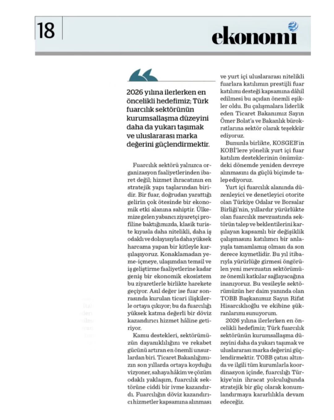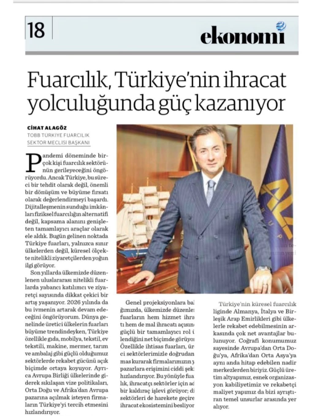 “Pandemi döneminde birçok kişi fuarcılık sektörünün gerileyeceğini öngörüyordu. Ancak Türkiye, bu süreci bir tehdit olarak değil, önemli bir dönüşüm ve büyüme fırsatı olarak değerlendirmeyi başardı. Dijitalleşmenin sunduğu imkânları fiziksel fuarcılığın alternatifi değil, kapsama alanını genişleten tamamlayıcı araçlar olarak ele aldık. Bugün gelinen noktada Türkiye fuarları, yalnızca sınır ülkelerden değil, küresel ölçekte nitelikli ziyaretçilerden yoğun ilgi görüyor. Son yıllarda ülkemizde düzenlenen uluslararası nitelikli fuarlarda yabancı katılımcı ve ziyaretçi sayısında dikkat çekici bir artış yaşanıyor. 2026 yılında da bu ivmenin artarak devam edeceğini öngörüyorum. Dünya genelinde üretici ülkelerin fuarları büyüme trendindeyken, Türkiye özellikle gıda, mobilya, tekstil, ev tekstili, makine, mermer, tarım ve ambalaj gibi güçlü olduğumuz sektörlerde rekabet gücünü açık biçimde ortaya koyuyor. Ayrıca Avrupa Birliği ülkelerinde giderek sıkılaşan vize politikaları, Orta Doğu ve Afrika’dan Avrupa pazarına açılmak isteyen firmaların Türkiye’yi tercih etmesini hızlandırıyor. Genel projeksiyonlara baktığımızda, ülkemizde düzenlenen fuarların hem hizmet ihracatı hem de mal ihracatı açısından güçlü bir tamamlayıcı rol üstlendiğini net biçimde görüyoruz. Özellikle ihtisas fuarları, üretici sektörlerimizle doğrudan temas kurarak firmalarımızın pazarlara erişimini ciddi şekilde hızlandırıyor. Bu yönüyle fuarcılık, ihracatçı sektörler için adeta bir kaldıraç işlevi görüyor, diğer sektörleri de harekete geçirerek ihracat ekosistemini besliyor. Türkiye’nin küresel fuarcılık liginde Almanya, İtalya ve Birleşik Arap Emirlikleri gibi ülkelerle rekabet edebilmesinin arkasında çok net avantajlar bulunuyor. Coğrafi konumumuz sayesinde Avrupa’dan Orta Doğu’ya, Afrika’dan Orta Asya’ya aynı anda hitap edebilen nadir merkezlerden biriyiz. Güçlü üretim altyapımız, esnek organizasyon kabiliyetimiz ve rekabetçi maliyet yapımız da bizi ayrıştıran temel unsurlar arasında yer alıyor.”