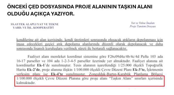 “DSİ, proje alanının sel taşkın alanı olduğunu ve olası zarar durumunda sorumluluk kabul etmediğini belirtmiş. Ayrıca Alaplı’ya içme suyu taşıyan isale hattı proje alanından geçiyor. Bu hattın beş metre yakınına bile yapı yapılmaması gerekiyor.”