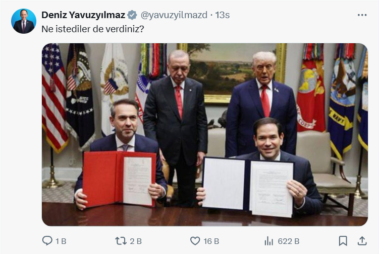 Cumhurbaşkanı Recep Tayyip Erdoğan, ABD Başkanı Donald Trump ile dün Beyaz Saray'da bir araya geldi. Görüşmede, iki ülke arasında, "Stratejik Sivil Nükleer İşbirliği Anlaşması" imzalandı. CHP Genel Başkan Yardımcısı ve Zonguldak Milletvekili Deniz Yavuzyılmaz sosyal medya hesabı üzerinden, imzalanan nükleer anlaşmaya ait fotoğrafı paylaşarak, "Ne istediler de verdiniz? ” dedi.