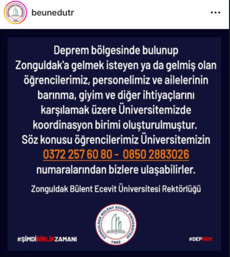 Merkez üssü Kahramanmaraş’ın Pazarcık ve Elbistan ilçeleri olan Gaziantep, Hatay, Kilis, Diyarbakır, Adana, Osmaniye, Şanlıurfa, Adıyaman ve Malatya’da büyük yıkıma yol açan 7.7 ve 7.6 büyüklüğündeki depremler sonrası Zonguldak Bülent Ecevit Üniversitesi yönetimi de harekete geçti.