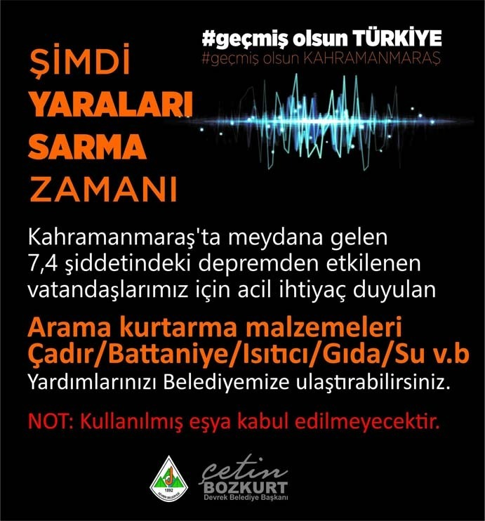 “Değerli hemşerilerim, Kahramanmaraş’ta meydana gelen ve bölgedeki birçok kenti etkileyen 7,4 büyüklüğünde depremde mağdur olan vatandaşlarımız için elektrikli ısıtıcı, sıfır battaniye, şişe su, dezenfektan, kolonya, pil, maske, çocuk bezi gibi ürünlerden oluşacak yardımlarınız için Belediyemiz bir kampanya düzenlemiş bulunmaktadır. Sizleri de kampanyamıza destek vermeye çağırıyor, duyarlılığınız için şimdiden teşekkürlerimi sunuyorum. Unutmayalım: Şimdi Yaraları Sarma Zamanı.”