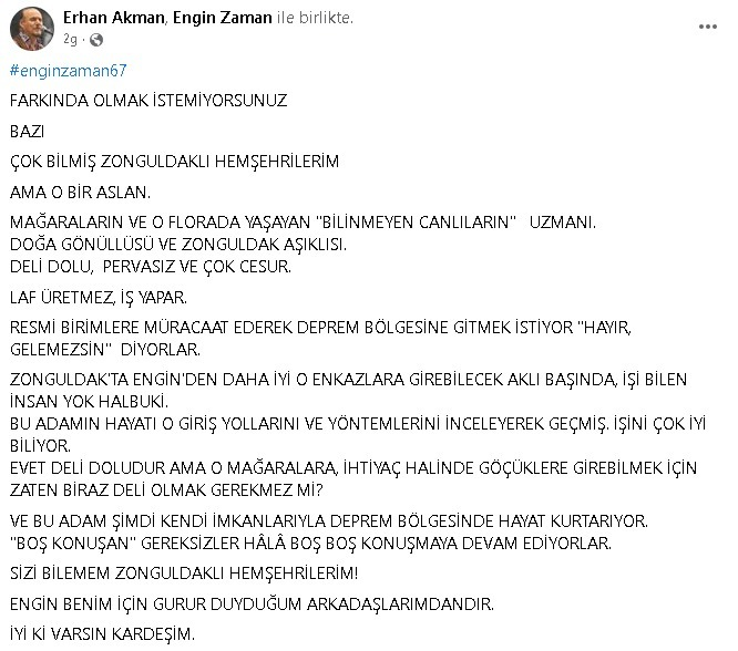Erhan Akman da sosyal medya hesabı üzerinden Engin Zaman için yaptığı paylaşımda şu ifadelere yer verdi: