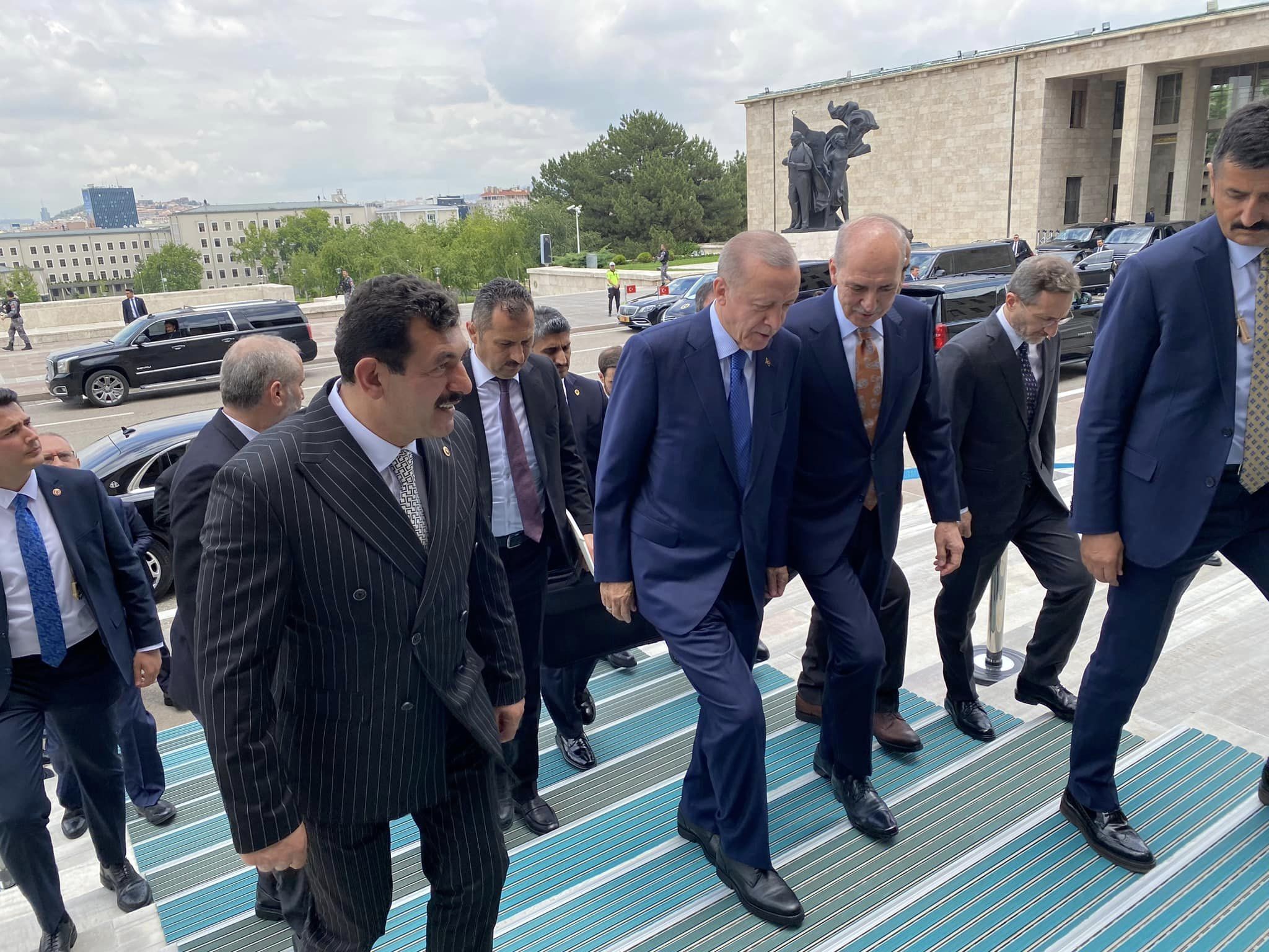 Karşılama sonrası, Cumhurbaşkanı Recep Tayyip Erdoğan, TBMM Başkanı Numan Kurtuluş ve AK Parti Milletvekili Muammer Avcı, meclise geçti.