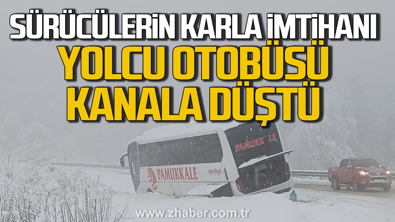 Zonguldak’tan İstanbul’a giden Pamukkale turizme ait otobüs Ereğli rampalarından indiği sırada zemindeki buzlanma nedeniyle kayarak ters dönüp kanala girdi.
