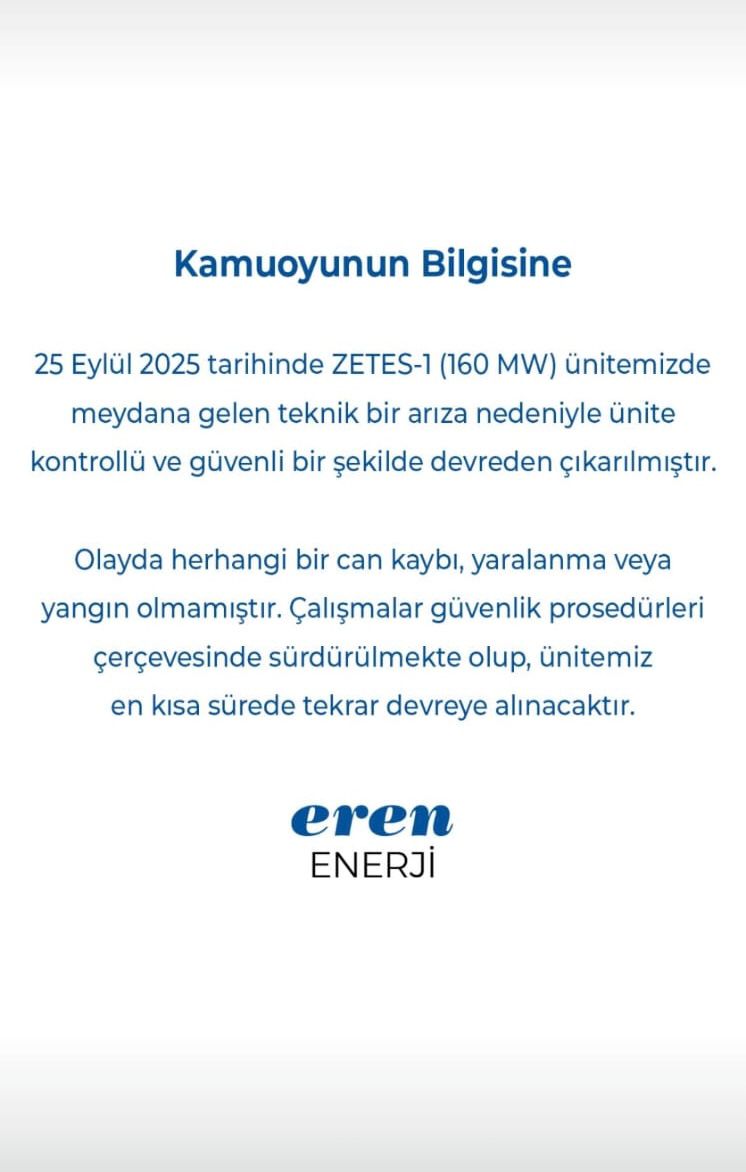 “25 Eylül 2025 tarihinde ZETES-1 (160 MW) ünitemizde meydana gelen teknik bir arıza nedeniyle ünite kontrollü ve güvenli bir şekilde devreden çıkarılmıştır.