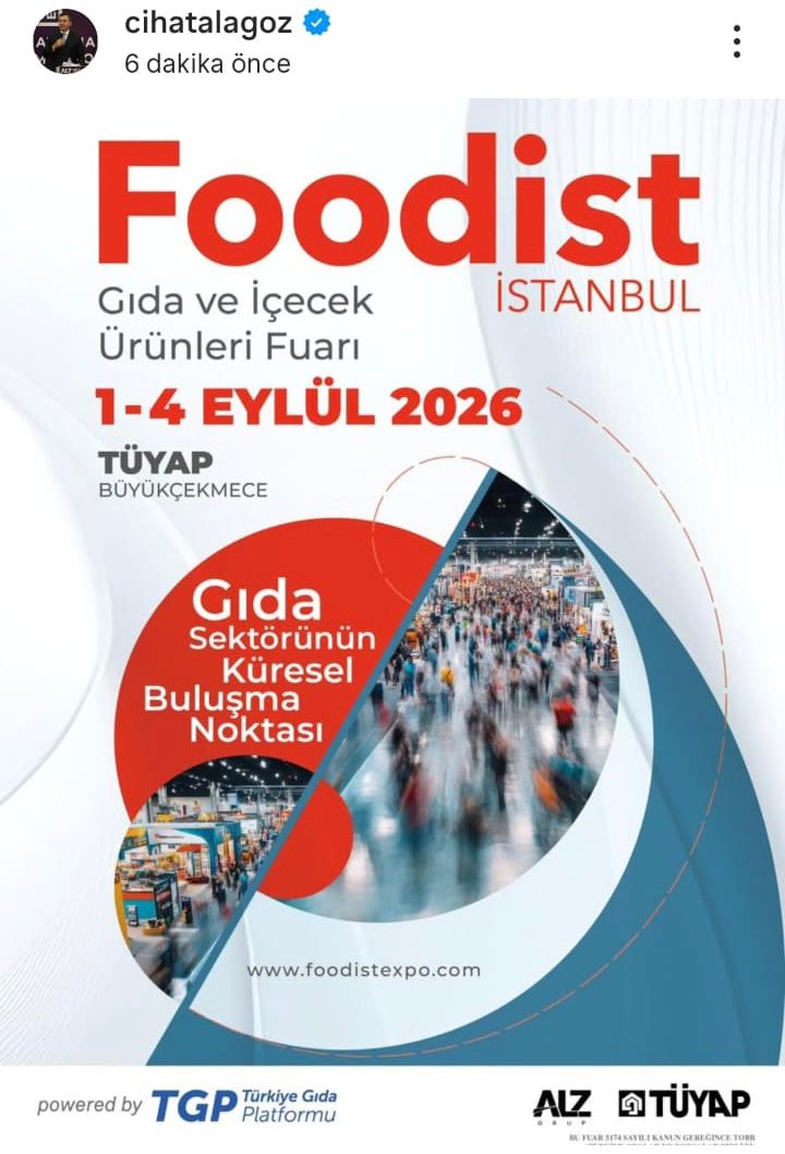 Küresel Gıda Sektörünü; Yönetim Kurulu Başkanı bulunduğum ALZ Grup ve TÜYAP Fuarcılık Grubu işbirliğinde, Türkiye Gıda Platformu’nun (TGP) güçlü desteğiyle, Türkiye’nin gıda sektörüne yönelik en kapsamlı ve en etkin fuarı olacak "Foodist İstanbul Gıda ve İçecek Ürünleri Fuarı"nda 1-4 Eylül 2026 tarihlerinde, TÜYAP Fuar ve Kongre Merkezi’nde buluşturacağız.