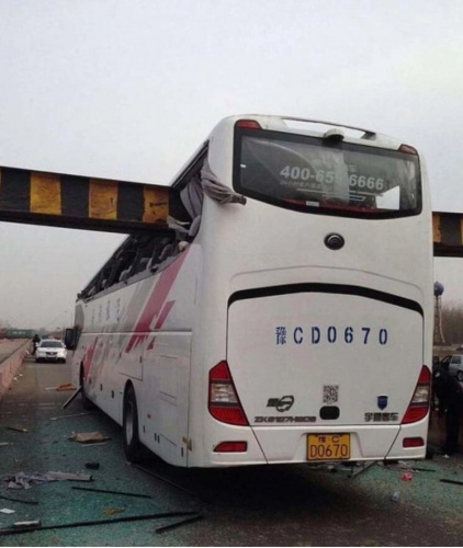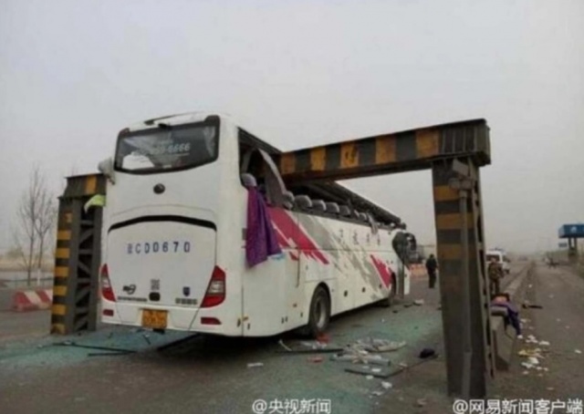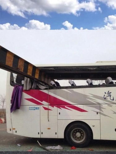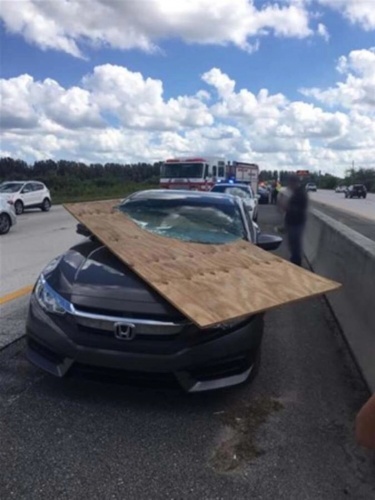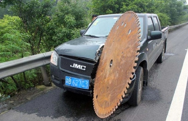 Pikap aracıyla otoyolda ilerleyen talihsiz adamın aracına inşaat makinasının testeresi fırladı ve ortaya bu görüntü çıktı. şans eseri kimsenin burnu bile kanamadı