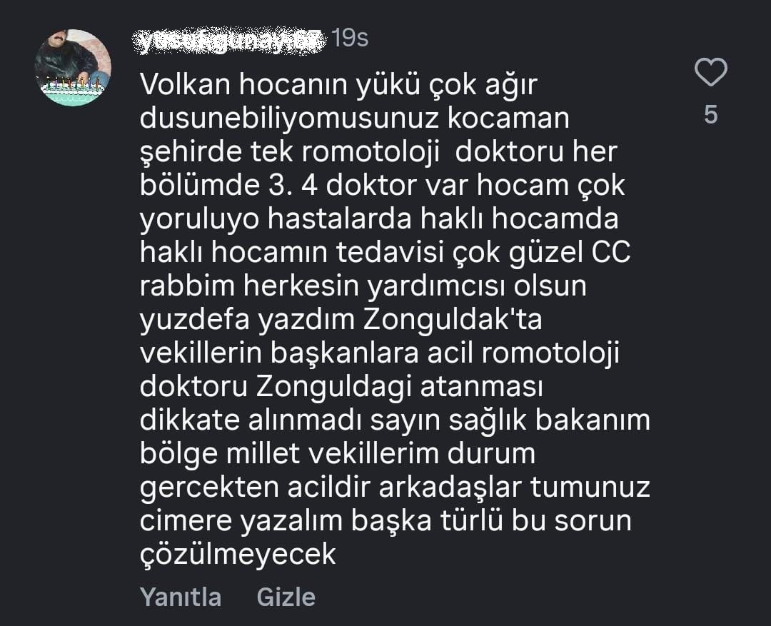 Zonguldak Atatürk Devlet Hastanesi Romatoloji Servisi’nde doktor ile hasta arasında yaşanan ve güvenlik görevlilerinin müdahalesiyle büyümeden önlenen tartışma, sosyal medyada büyük tepki çekti. Z HABER’in yaptığı haberin altında şikâyetlerini dile getiren onlarca hastaya Doktor V.Y. tek tek yanıt verdi. V.Y., hakaret içerikli yorumlar hakkında ise hukuki sürecin başlatılacağını belirtti.
