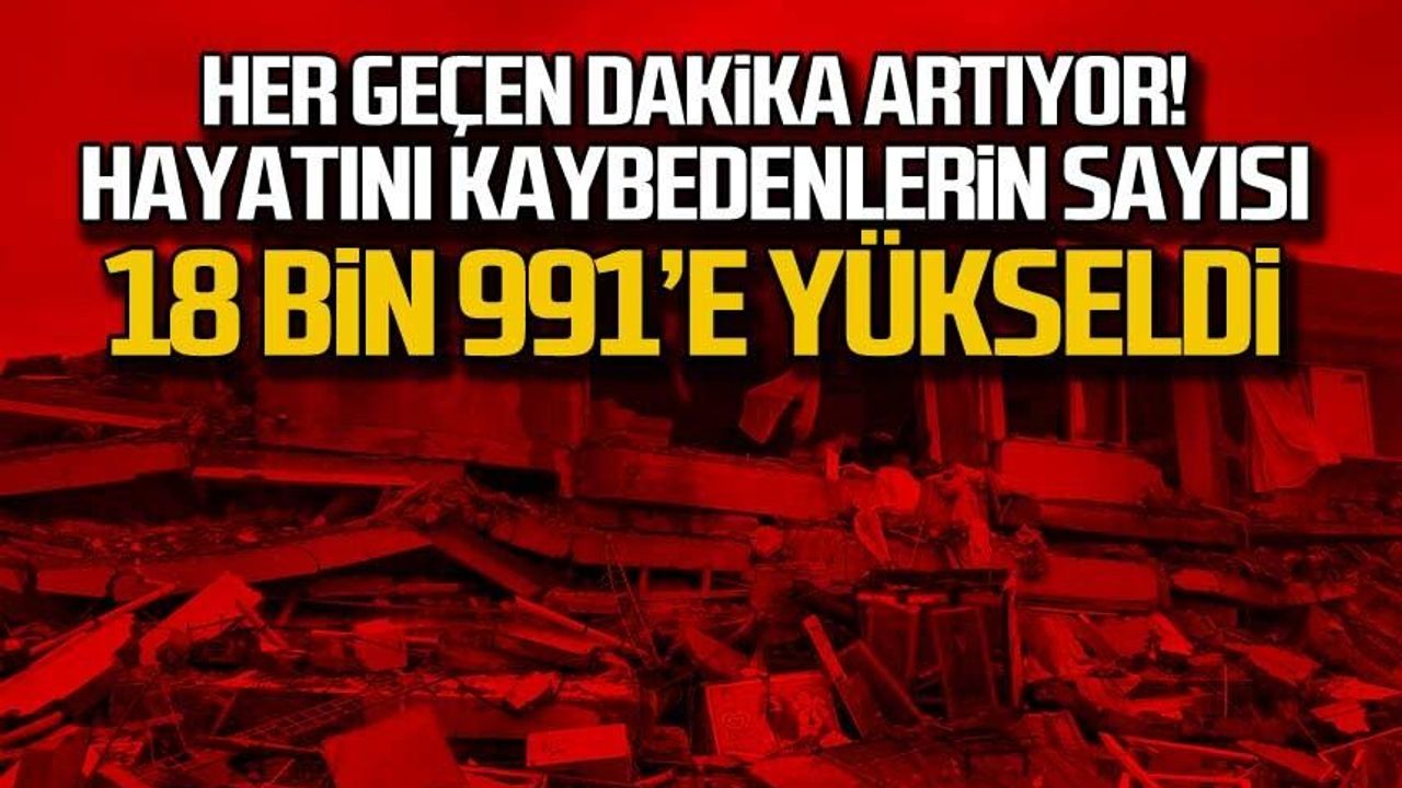 Cumhurbaşkanı Erdoğan: Yaşadığımız acıyı tarif etmekte kelimelerin kifayetsiz kaldığını gayet iyi biliyorum. Maalesef son tespitlere göre 10 ilimizde hayatını kaybeden vatandaşlarımızın sayısı 18 bin 991'e yükseldi. Kurtarılanların sayısı 75 bin 523'e ulaştı.