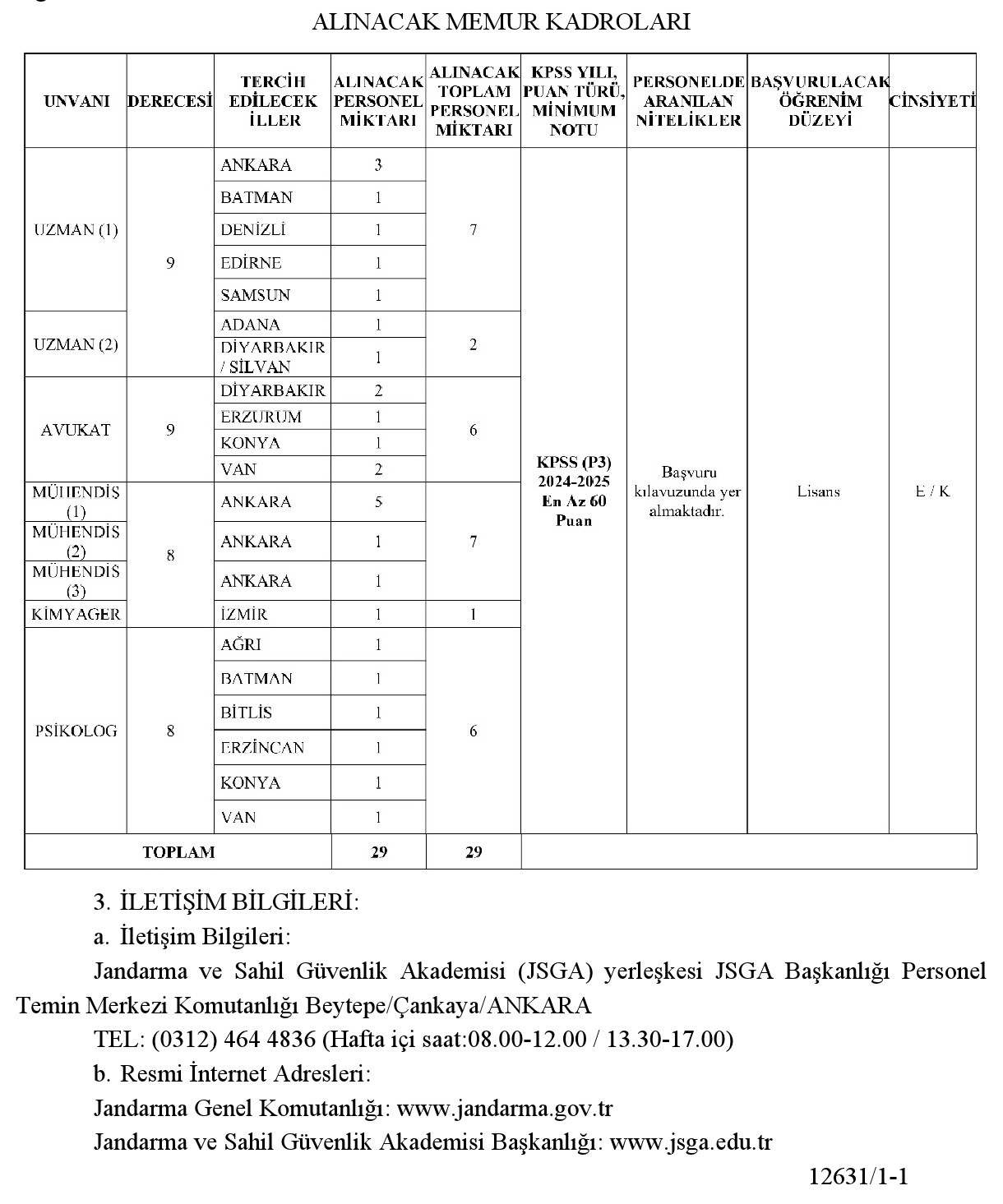 “Jandarma Genel Komutanlığına Tablo'da yazılı kadrolara, "Jandarma Genel Komutanlığı ve Sahil Güvenlik Komutanlığında İlk Defa Devlet Memurluğuna Atanacaklar İçin Yapılacak Sınavlar Hakkında Yönetmelik" hükümleri doğrultusunda 657 Sayılı Devlet Memurları Kanununa tabi açıktan atama yoluyla; J.Gn.K.lığı karargahı ile bağlı birlik ve kurumlarında istihdam edilmek üzere (29) açıktan devlet memuru temin edilecektir.