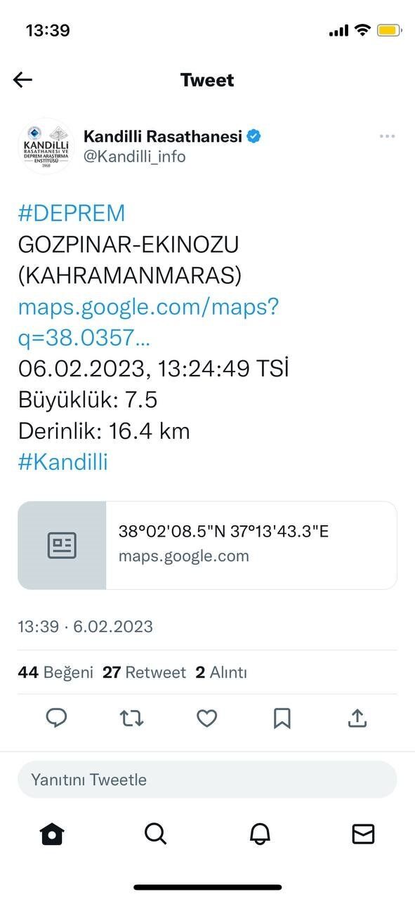 Kahramanmaraş'ta meydana gelen 7.7'lik depremin ardından saat 13.24'te 7.5 büyüklüğünde bir deprem daha meydana geldi. Yaşanan deprem Diyarbakır, Malatya, Şanlıurfa, Ankara, Adana gibi illerden hissedildi.