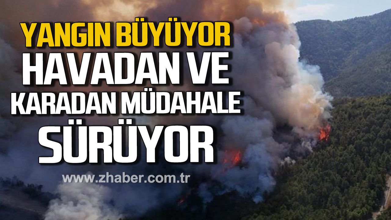 Yangının ilerlemesini durdurmak için iş makineleriyle yol açma çalışmaları yürütülüyor. Alevler, dron ile görüntülenirken, bir yangın söndürme helikopteri de havadan su atarak müdahalede bulunuyor. Yangın söndürme çalışmaları hem karadan hem havadan sürüyor.