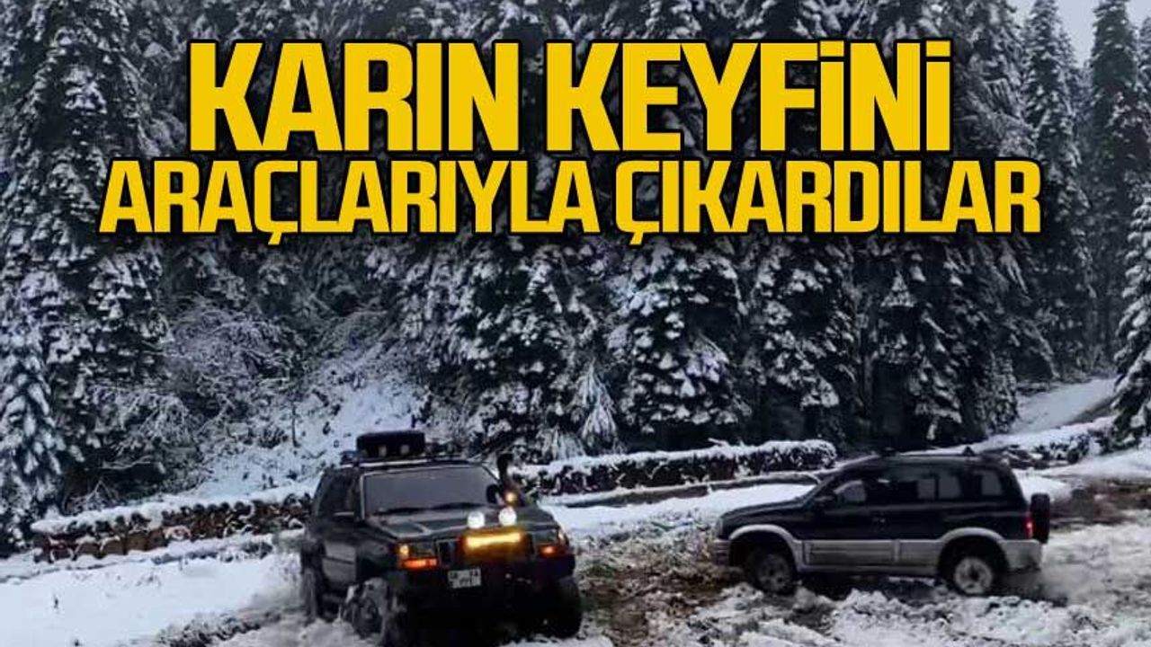 Yaylaya çıkarak eşsiz kar manzaralarını yerinde görmek isteyen arazi araçlarının sahipleri karla kaplı bölgede gösteri yaparak unutulmaz anlar yaşadı.