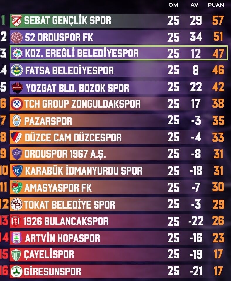 25.hafta itibarıyla topladığımız 47 puanla ligde 3. sırada yer almanın gururunu yaşıyoruz. Bu süreçte ortaya koyduğumuz mücadele ve istikrarlı performansla play-off potasının en güçlü adaylarından biri olmayı başardık.