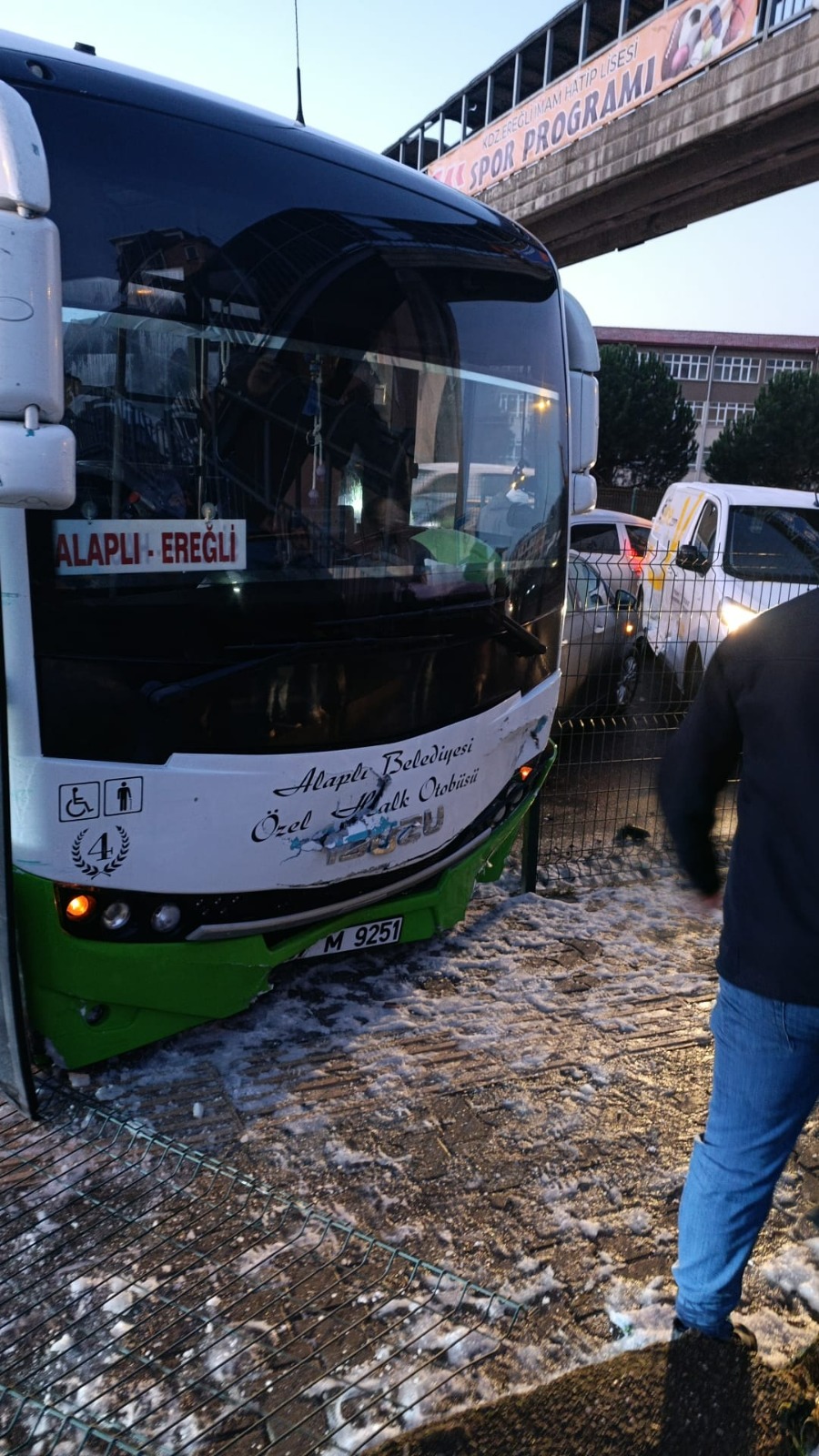 Kaza, sabah saatlerinde Ereğli ilçesi Yeşiltepe Mahallesi Devrek Yolu Caddesi'nde meydana geldi. Yoldaki buzlanma nedeniyle halk otobüsü, işçi servisi, hafif ticari araç ve 2 otomobil, kayarak birbirine çarptı. Kazada araçlarda hasar oluştu. Kaza nedeniyle yol trafiğe kapandı. İhbarla bölgeye gelen polis ekiplerinin müdahalesi ile araçlar yoldan kaldırıldı. Araç sürücüleri, hazırlanan kaza tutanağının ardından olay yerinden ayrıldı. Yolda ulaşım normale döndü.
