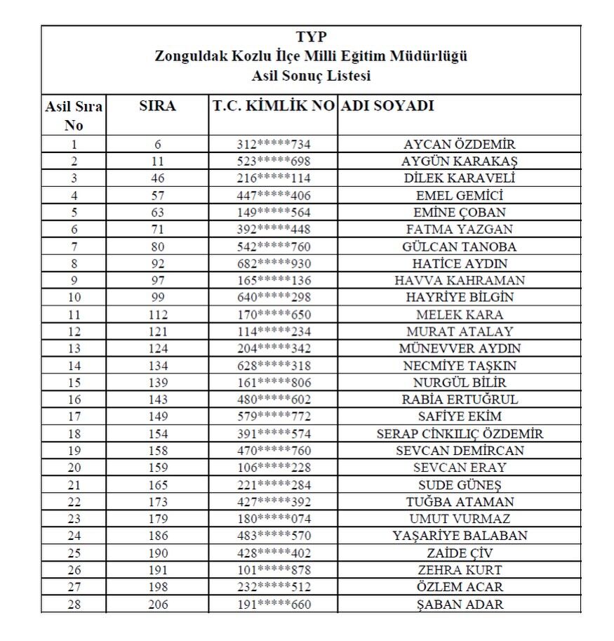 Kozlu İlçe Milli Eğitim Müdürlüğü bünyesine Toplum Yararına Program (TYP) kapsamında alınacak 28 kişi belli oldu.