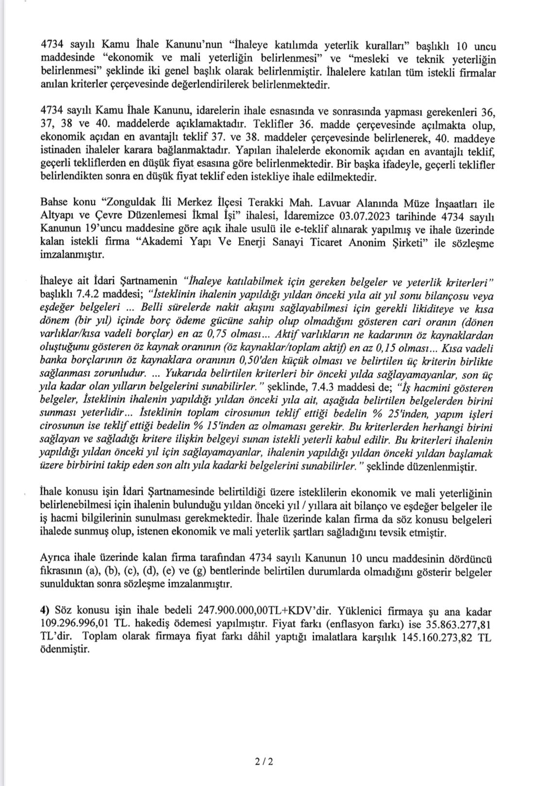 Bakanlık, yüklenici firmanın sözleşmesinin feshedilmesinin veya devredilmesinin gündemde olmadığını bildirdi. İhale sürecinin 4734 sayılı Kamu İhale Kanunu’na uygun şekilde yürütüldüğü vurgulandı. Sözleşme bedeli 247 milyon TL + KDV olan projede, yükleniciye bugüne kadar 109 milyon TL hakediş, 35,8 milyon TL enflasyon farkı olmak üzere toplam 145,1 milyon TL ödeme yapıldığı açıklandı.