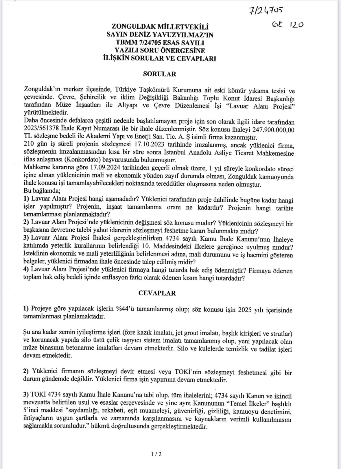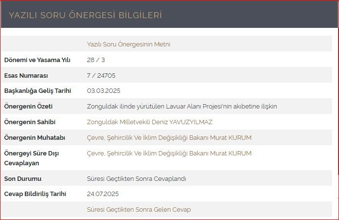 Cumhuriyet Halk Partisi (CHP) Genel Başkan Yardımcısı ve Zonguldak Milletvekili Deniz Yavuzyılmaz’ın, Lavuar Alanı Projesi’nin akıbetine ilişkin verdiği soru önergesi, beş ay sonra Çevre, Şehircilik ve İklim Değişikliği Bakanlığı tarafından yanıtlandı. Bakanlık, projede fiziki ilerlemenin, daha önce AK Parti kanadından yapılan açıklamaların aksine, daha düşük seviyede olduğunu açıkladı.