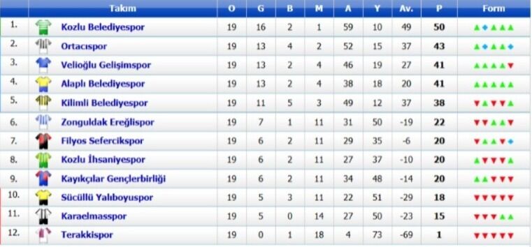 19 HAFTA DA ALINAN SONUÇLAR Terakkispor 0 - 3* Karaelmasspor Sücüllü Yalıboyuspor 2 - 5 Kozlu Belediyespor Filyos Sefercikspor 0 - 0 Ortacıspor Kozlu İhsaniyespor 4 - 3 Zonguldak Ereğlispor Alaplı Belediyespor 3 - 1 Velioğlu Gelişimspor Kayıkçılar Gençlerbirliği0 - 4 Kilimli Belediyespor