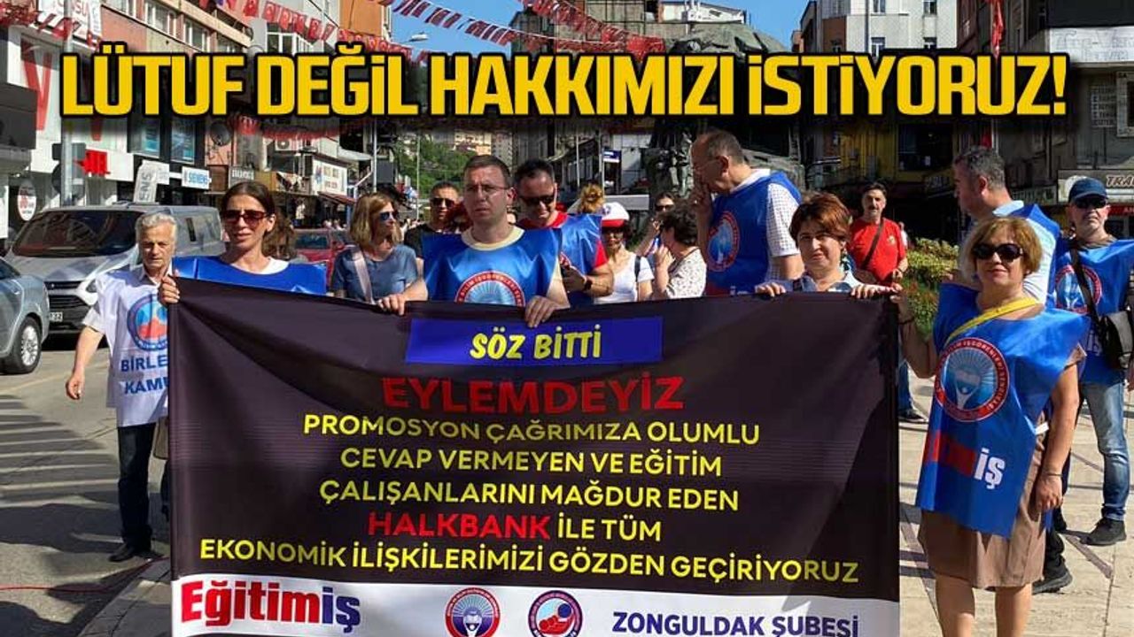 Madenci Anıtı'nda toplanan Eğitim İş Sendikası üyeleri, promosyonda istediklerini alamadıkları ve eğitim çalışanlarını mağdur ettiği gerekçesiyle Halk Bankası ile bütün ilişkilerini kestiklerini ifade ettiler.