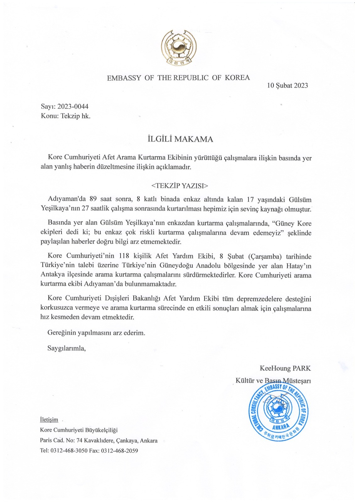 Öte yandan Kore Cumhuriyeti Büyükelçiliği Kültür ve Basın Müsteşarı KeeHoung Park Kore arama kurtarma ekibinin Adıyaman'da değil Hatay'da olduğunu belirterek konu ile ilgili şu açıklamayı yayınladı