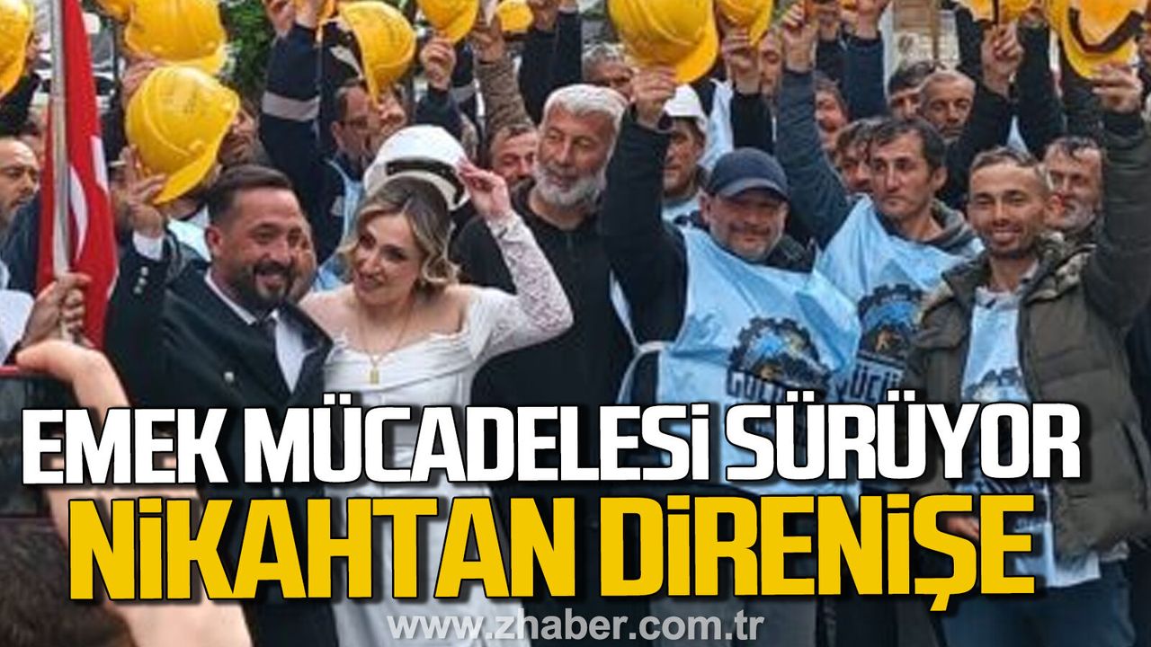 İşçilerin nöbeti devam ederken parkın içinde bulunan Evlendirme Dairesi’nde evlenen bir çift, nikah töreninin ardından işçileri ziyaret etti. İşçilerin direnişini selamlayan çifte işçiler de baretlerini çıkararak selam verdi.