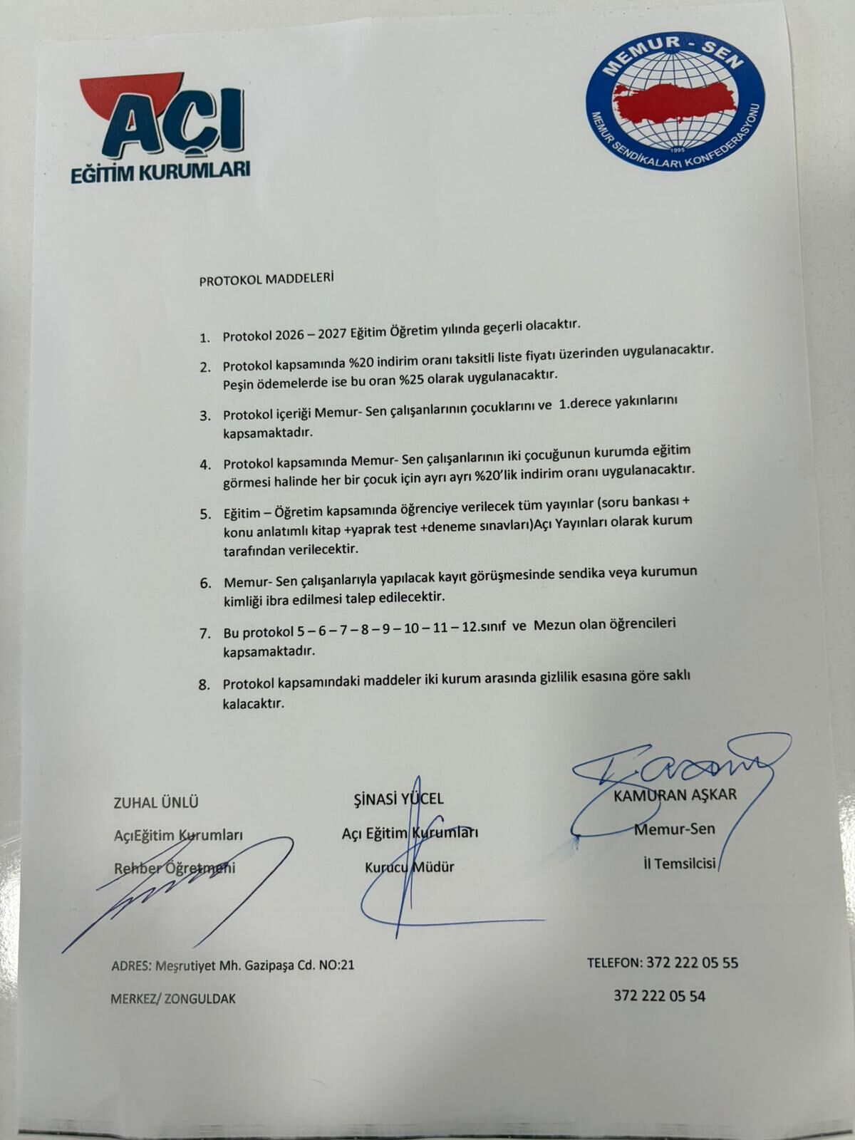 Memur Sen Zonguldak il temsilciliğimiz ve Açı Eğitim kurumları arasında 2026-2027 yılına ait indirim sözleşmesi imzalandı. İmzalanan indirim sözleşmesine göre Memur Sen üyeleri ve birinci derece yakınları liste fiyatları üzerinden %20 indirimli faydalanacaklardır. Yapılan protokol bir yıl geçerli olup; 5-6-7-8(ortaokul),9-10-11-12. Sınıf(lise) öğrencilerini kapsayacaktır. Yapılan anlaşma her iki kuruma da hayırlı olmasını temenni ederiz.”