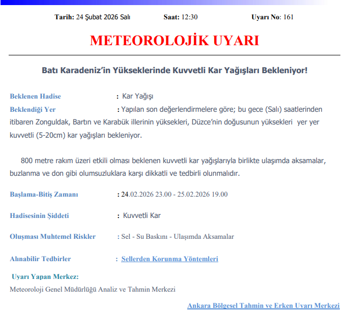 “Yapılan son değerlendirmelere göre; bu gece (Salı) saatlerinden itibaren Zonguldak, Bartın ve Karabük illerinin yüksekleri, Düzce’nin doğusunun yüksekleri yer yer kuvvetli (5-20cm) kar yağışları bekleniyor. 800 metre rakım üzeri etkili olması beklenen kuvvetli kar yağışlarıyla birlikte ulaşımda aksamalar, buzlanma ve don gibi olumsuzluklara karşı dikkatli ve tedbirli olunmalıdır.”