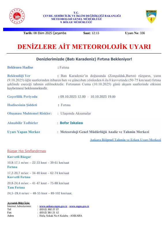 (9.10.2025) öğle saatlerinden itibaren batı ve güneybatı yönlerden 6 ila 8 kuvvetinde (50-75 km/saat) fırtına şeklinde eseceği tahmin edilmektedir. Fırtınanın Cuma (10.10.2025) günü akşam saatlerinde etkisini kaybetmesi beklenmektedir.