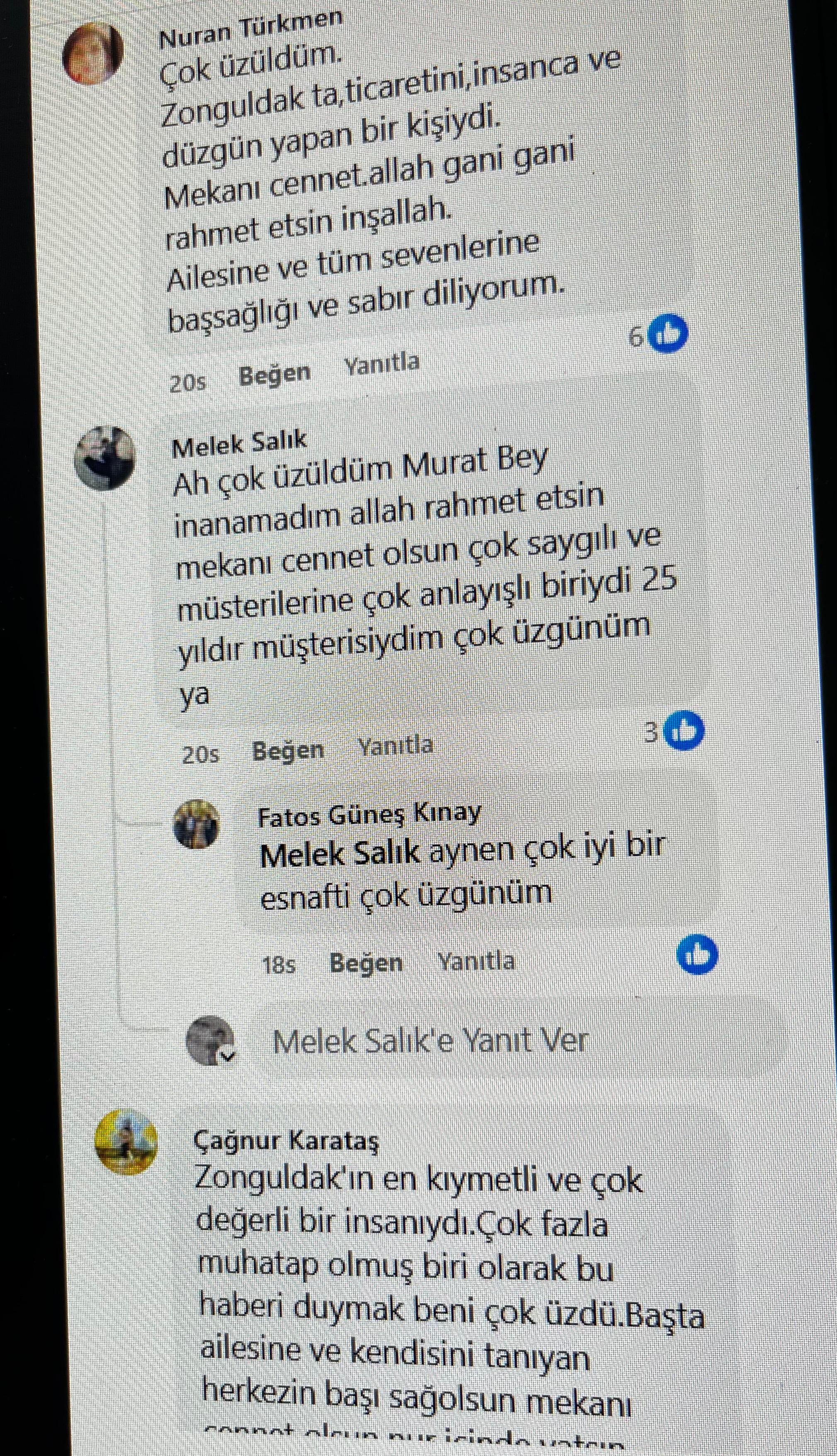 “Evlenirken mobilya almak için gitmiştim. Maddi durumumum iyi değildi. Çok yardımcı oldu. Ödemeleri kolaylaştırdı. Beni o kadar rahatlattı ki hep ona dua ettim. Allah mekanını cennet eylesin. Örnek bir esnaftı.” sözleriyle duygulara tercüman oldu.