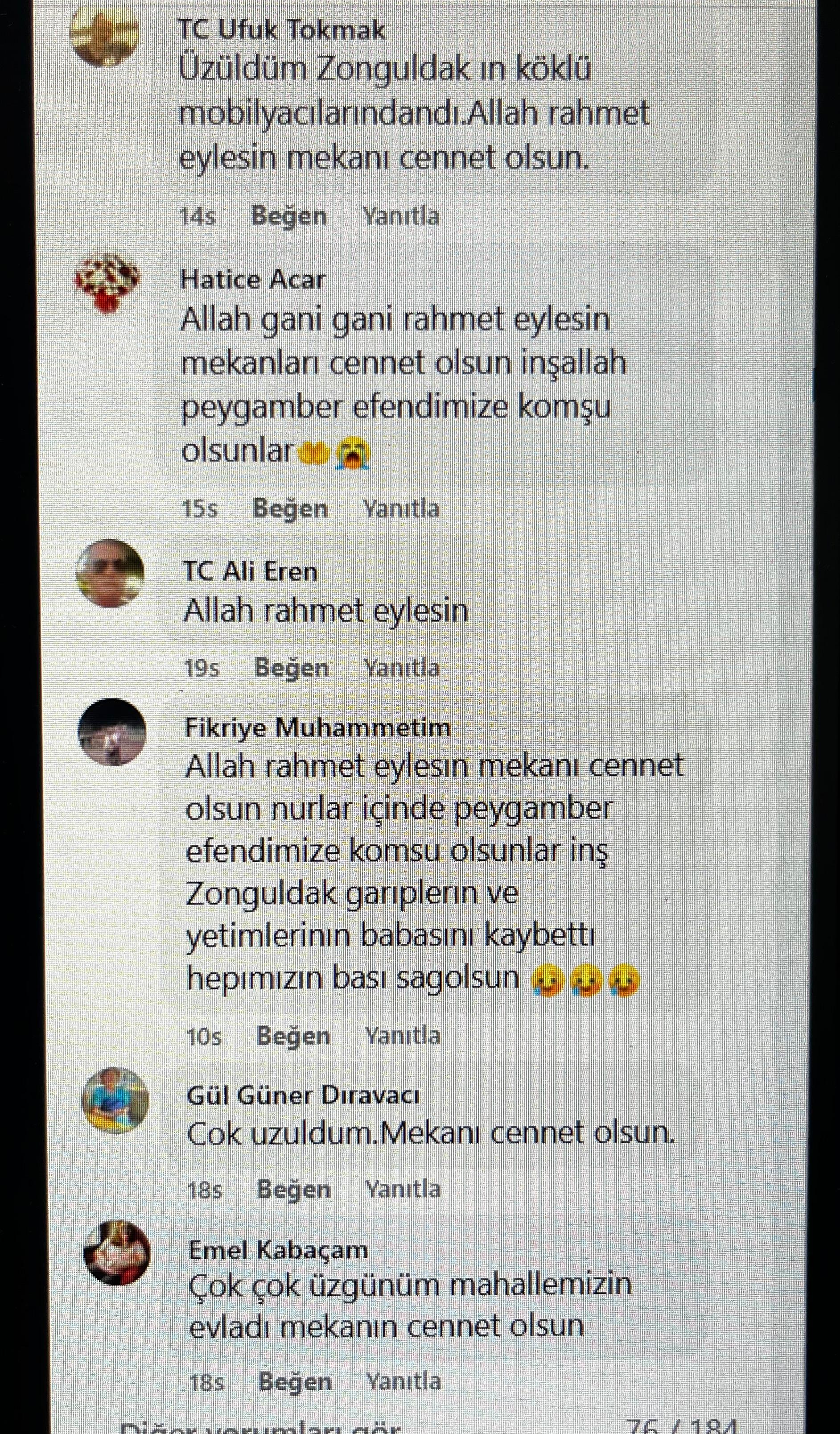 Bir başka kişi ise, “Zonguldak, gariplerin ve yetimlerin babasını kaybetti. Hepimizin bası sağ olsun.” Sözleriyle dikkat çekti.