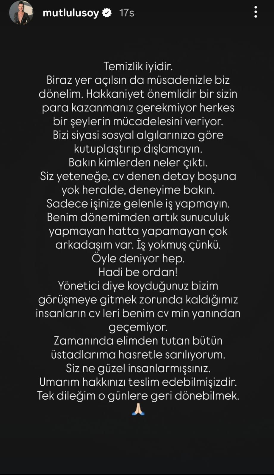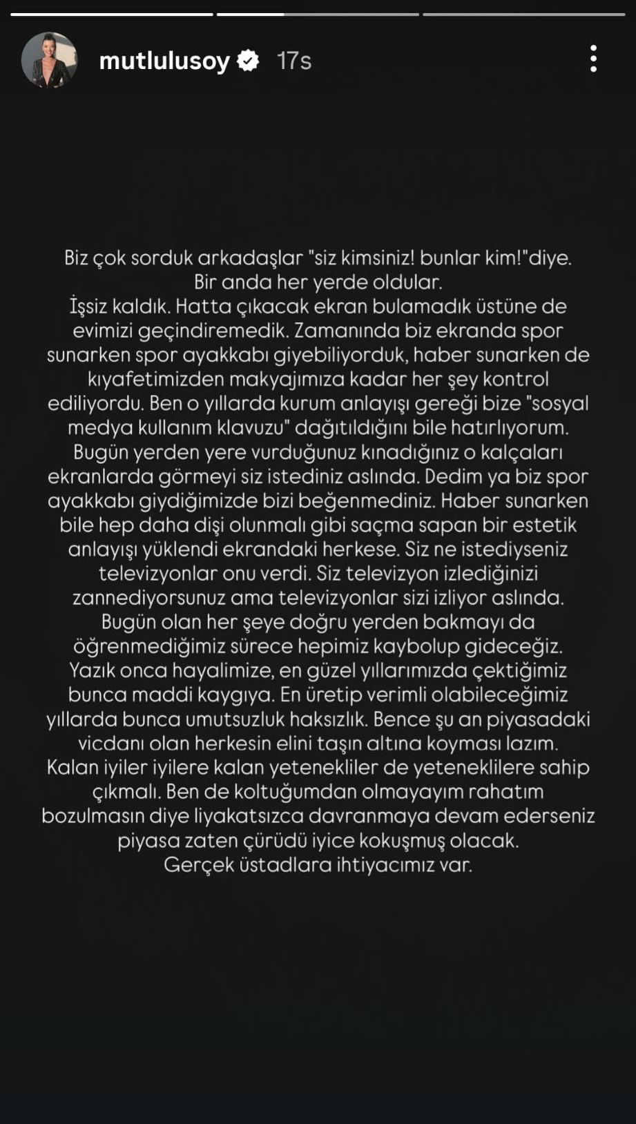 Konu hakkında Zonguldak Devrekli sevilen sunucu Mutlu Ulusoy, sosyal medya hesabında dikkat çeken paylaşımda bulundu. Ulusoy;“Temizlik iyidir. Biraz yer açılsın da müsaadenizle biz dönelim. Yönetici diye koyduğunuz bizim görüşmeye gitmek zorunda kaldığımız insanların cvleri benim cv’min yanından geçemiyor. Bunlar bir anda her yerde oldular. Biz işsiz kaldık. Haber sunarken de kıyafetlerimizden makyajımıza kadar her şey kontrol ediliyordu” ifadelerini kullandı.