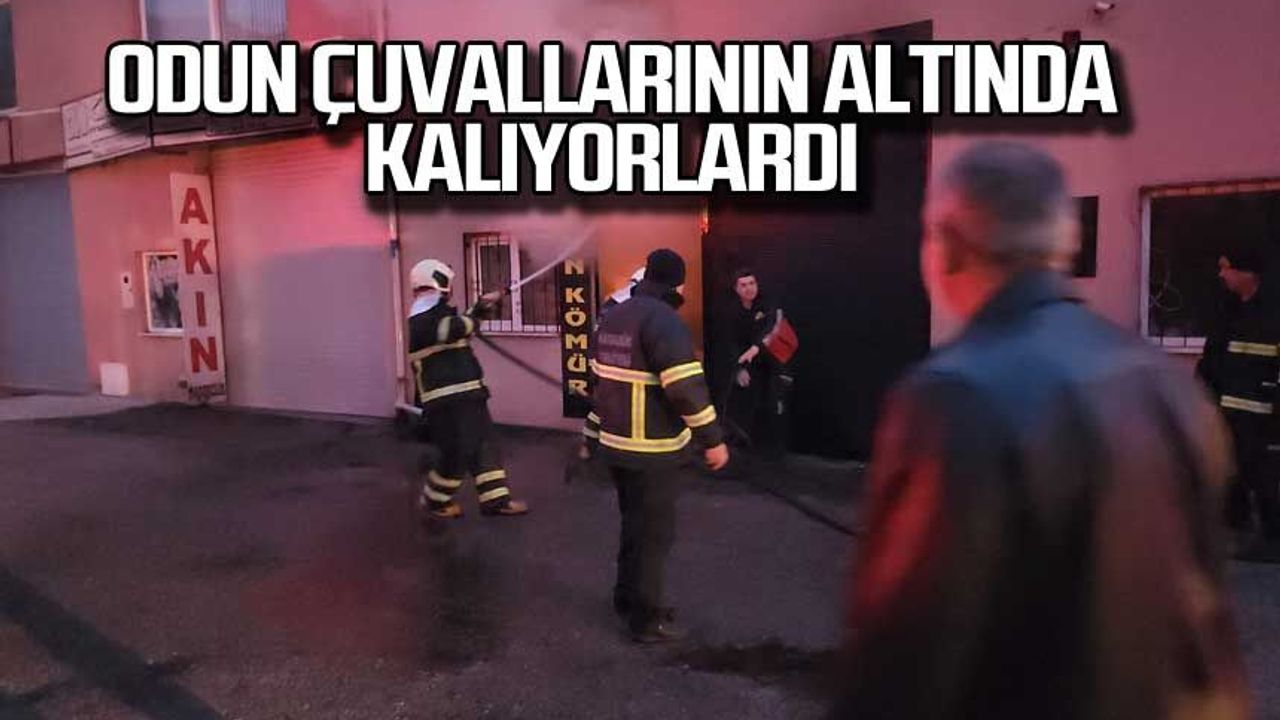Kömür ve odun çuvallarının yığılı olduğu işyerindeki yangına müdahale eden ekipleri devrilen odun çuvalların altında kalmaktan ise son anda kurtuldu.