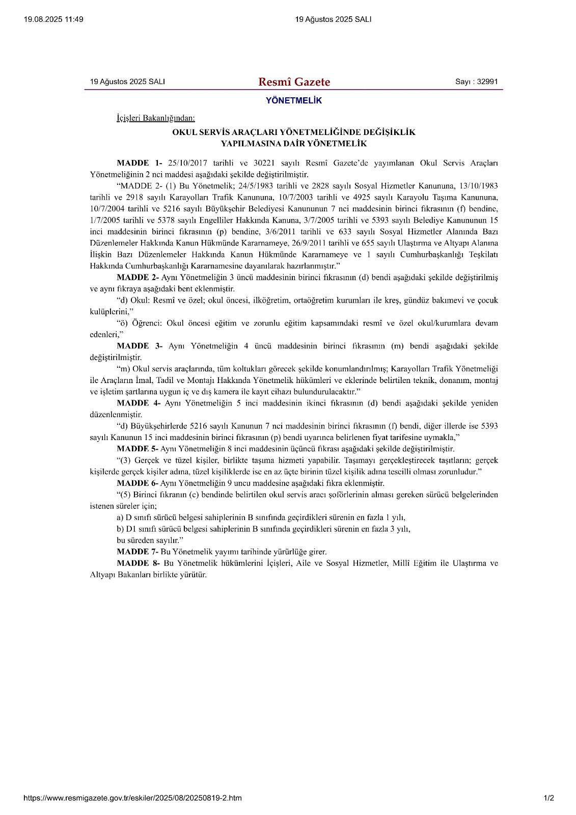 19 Ağustos 2025 tarihli Resmî Gazetede yayımlanan yönetmelik değişikliğiyle, okul servis ücretlerine ilişkin düzenleme yapıldı. Buna göre, büyükşehirlerde 5216 sayılı Kanun kapsamında, diğer illerde ise 5393 sayılı Belediye Kanunu uyarınca okul servis ücretleri artık belediyeler tarafından belirlenecek.
