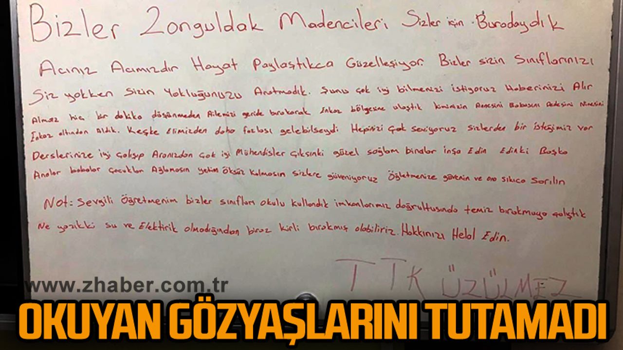 Türkiye Taşkömürü Kurumu (TTK) yaklaşık 4 bin işçi ve mühendisiyle deprem bölgesindeki çalışmalarına aralıksız devam ediyor. Arama ve kurtarma çalışmasını sürdüren madenciler yüzlerce yaralıyı kurtarmayı başardı. Hatay'da bir okulda dinlenen TTK Üzülmez madencileri, tahtaya yazdığı notla duygulandırdı.