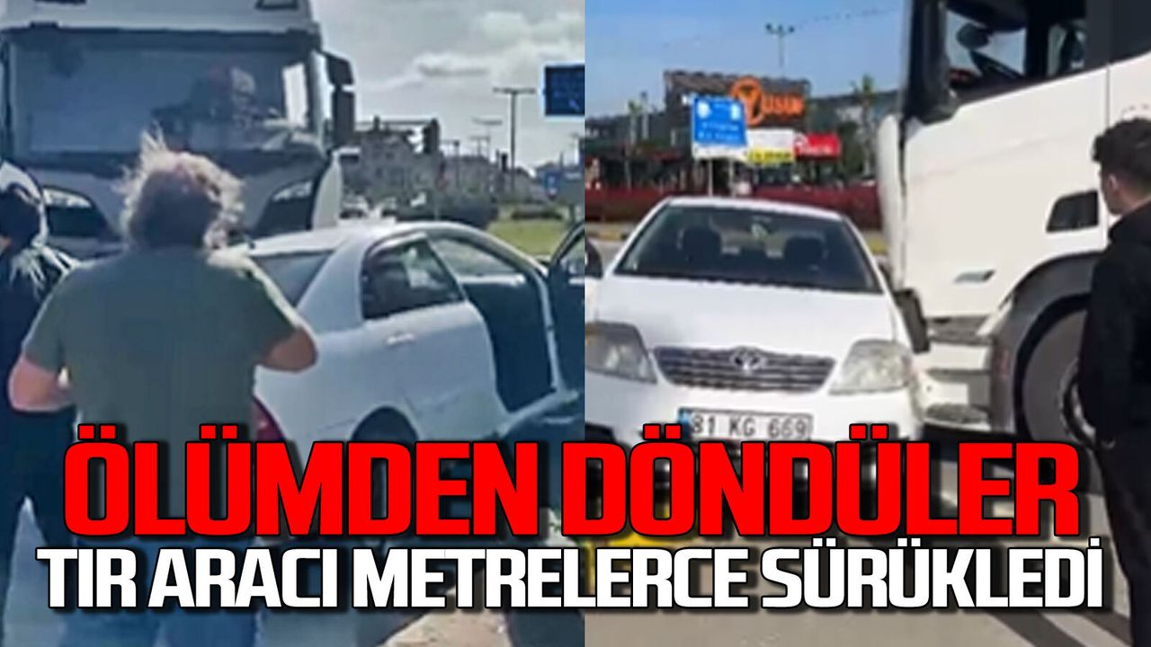 Zonguldak’ın Alaplı İlçesi’nde çok büyük kaza ucuz atlatıldı. Alaplı’nın Akçakoca Caddesi’nde meydana gelen kazada tır şoförü önündeki otomobili fark etmedi. Kavşakta önüne aldığı otomobili metrelerce sürükleyen tır zor durabildi.